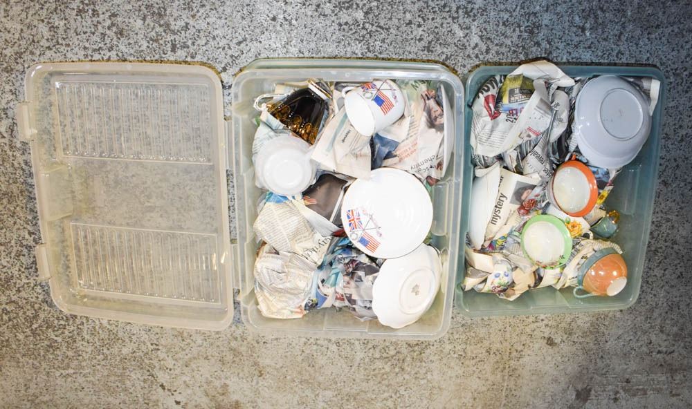 2-CONTAINERS OF TEA CUPS AND SAUCERS