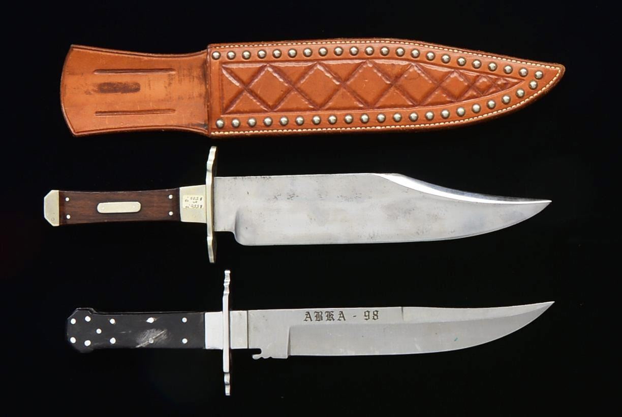 1) Overall length: 14 1/2”. Blade length: 9 1/2". Flat, plain bowie style blade etched w/ an etching pen at the ricasso, “P.C. Ashley Bham.Ala”. German silver crossguard, ferrule & pommel. 2 Piece wood grip w/ 4 steel pins on each side. German silver escutcheon on each side attached by 2 steel pins. Stud embellished & tooled leather sheath. CONDITION: blade & sheath show light wear overall. 2) Overall length: 14”. Blade length: 9 1/8”. Bowie style blade w/ decoratively cut lower ricasso. Blade is etched horizontally near the spine, “ABKA - 98” indicating presentation by the Antique Bowie Knife Association. Polished steel crossguard & ferrule. 2 Piece horn grip attached by 11 pins on each side. No sheath. CONDITION: blade shows light wear. Grip has some filled areas likely due to improperly made grip. PROVENANCE: Collection of Roger Ballard. (02-14709-22/BF). $300-500.