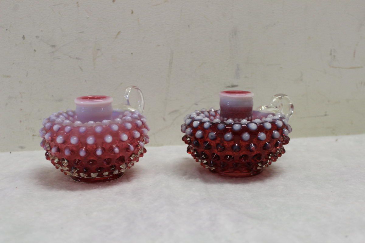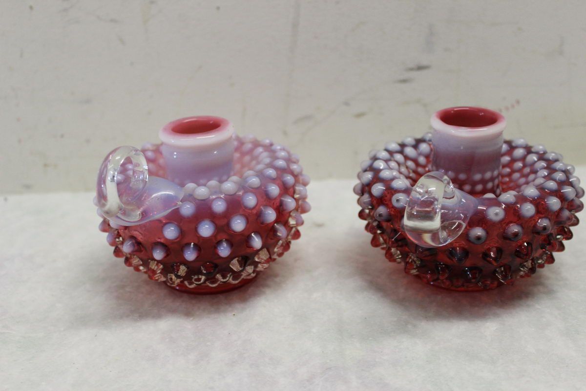 2 CRANBERRY HOBNAIL OPALESCENT CANDLE HOLDERS - 3.5 HIGH X 4.5 WIDE