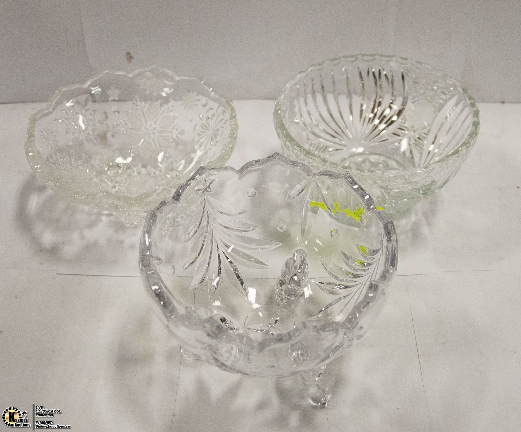 CRYSTAL SNOWFLAKE BOWL 2.75" x 6 7/16"x 2.75"TALL, CRYSTAL BOWL WITH INTRINSIC DESIGN 3"BOTTOM - 6 1/8"TOP x 3 3/8" TALL, GLASS CHRISTMAS TREE BOWL 4.25" BOTTOM - 6" TOP x 4.25" TALL