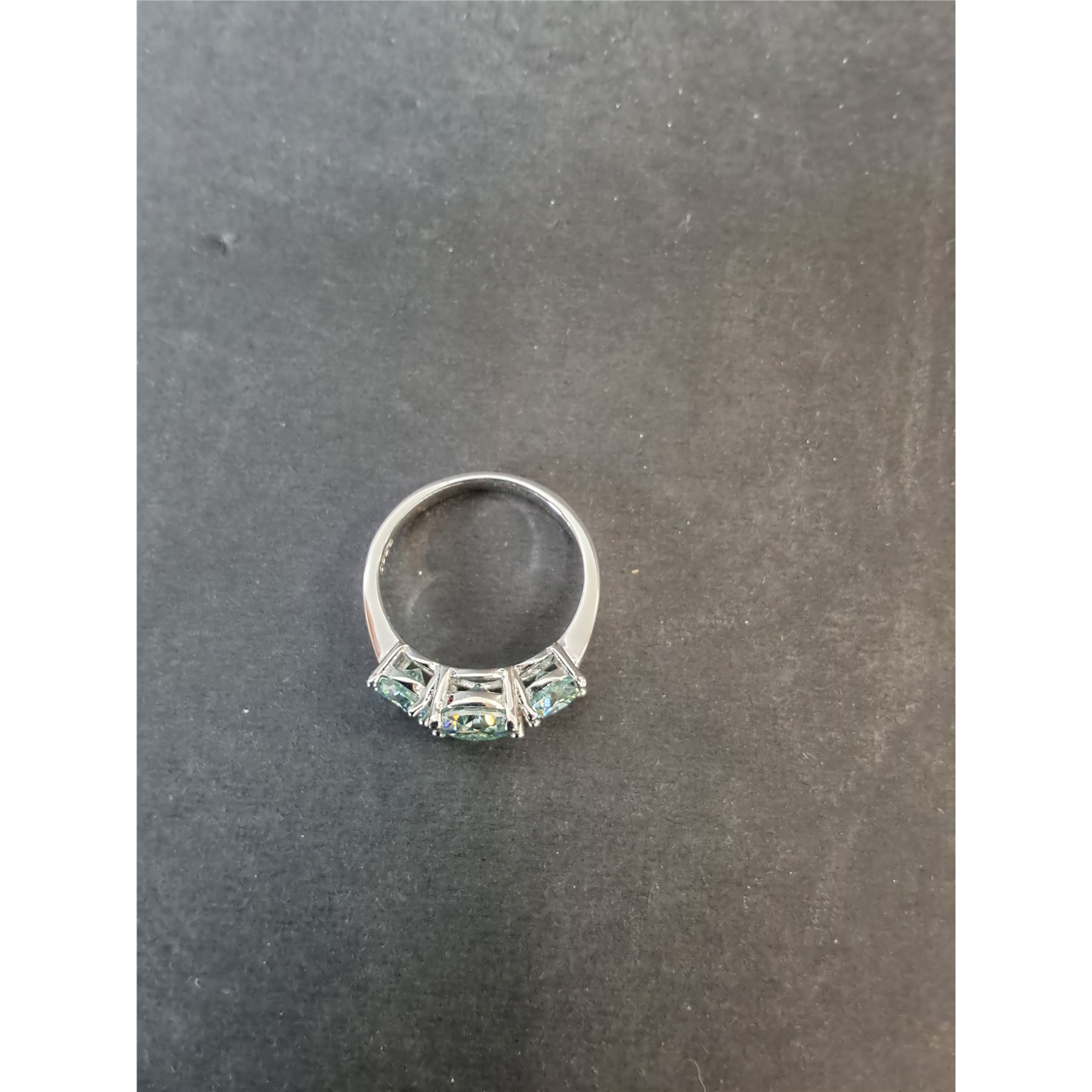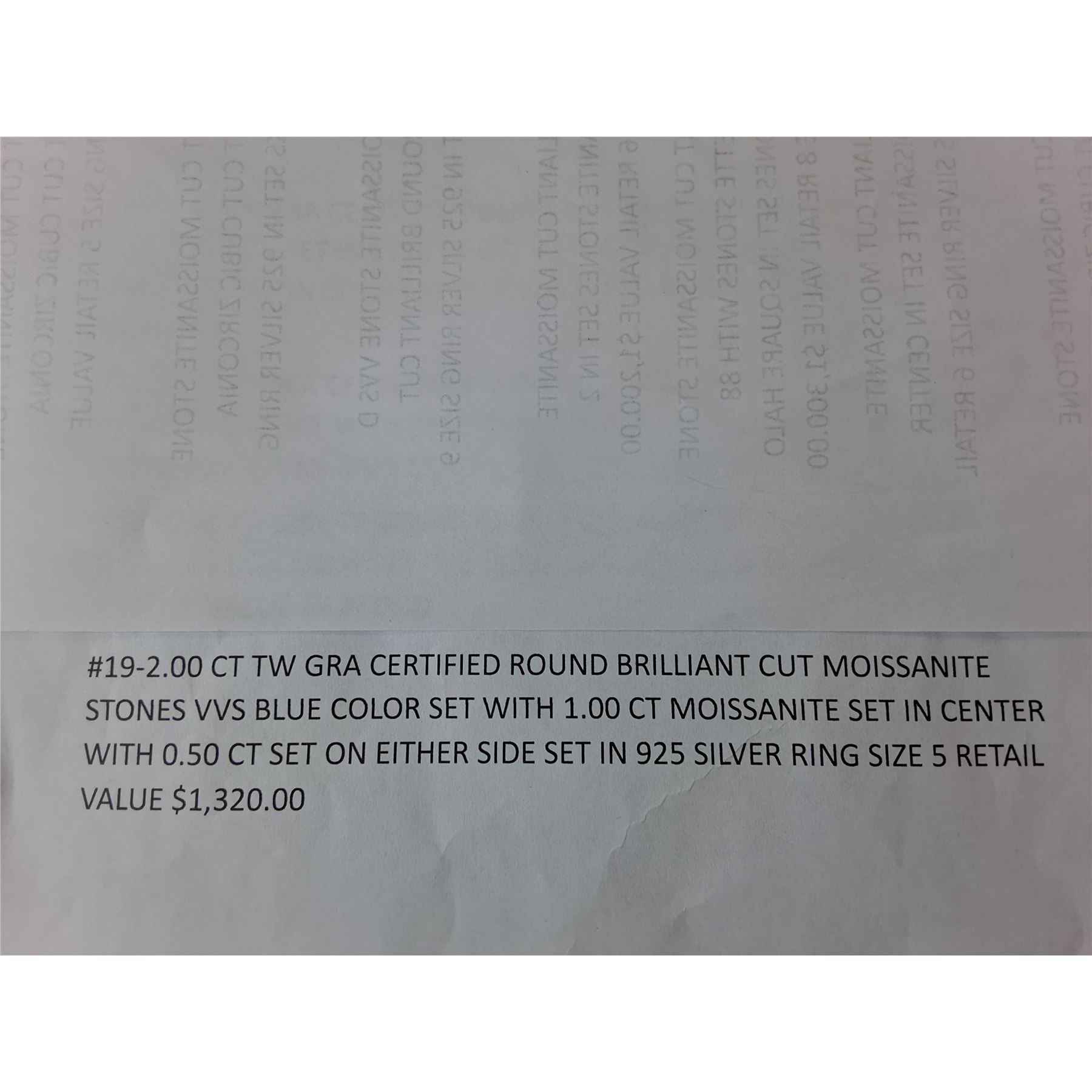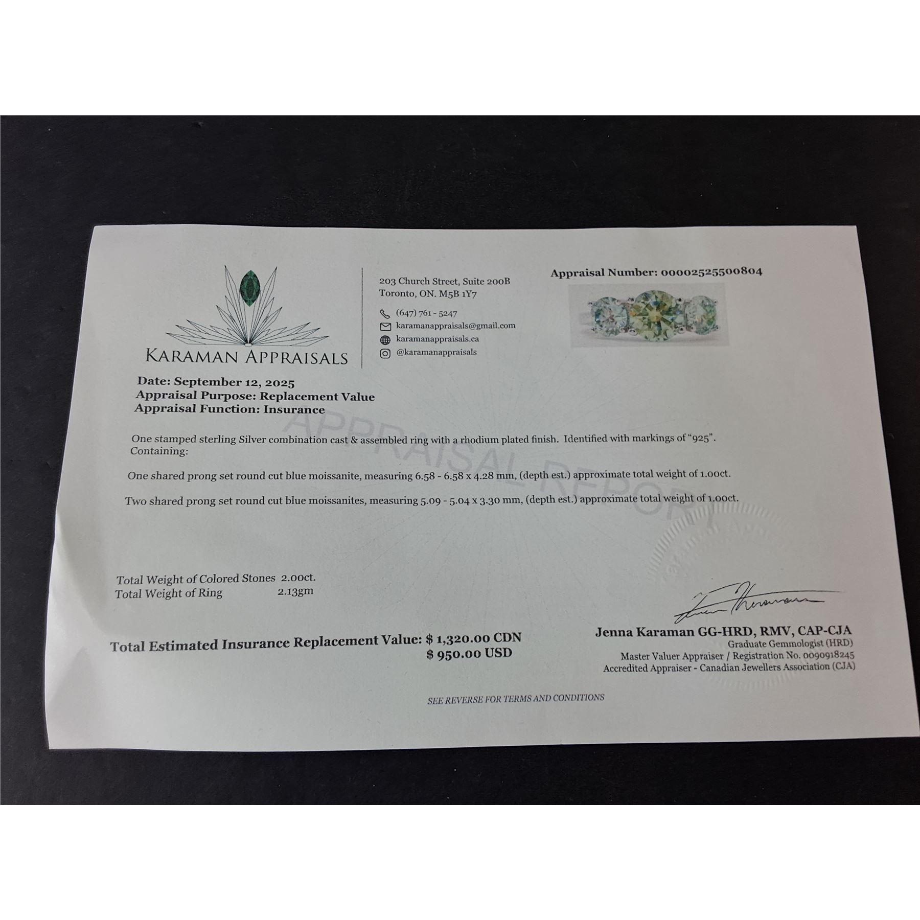 2.00 CT TW GRA CERTIFIED ROUND BRILLIANT CUT MOISSANITE STONES VVS BLUE COLOR SET WITH 1.00 CT MOISSANITE SET IN CENTER WITH 0.50 CT SET ON EITHER SIDE SET IN 925 SILVER RING SIZE 5 RETAIL VALUE $1,320.00