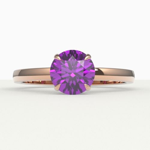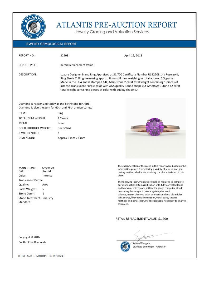 REF-25X6T -22208 ---- 2 CTW Amethyst Designer Inspired Solitaire Engagement Ring 14K Rose Gold ---- Luxury Designer Brand Ring Appraised at $1,700 Certificate Number US22208 14k Rose gold, Ring Size is 7, Ring measuring approx. 8 mm x 8 mm, weighing in total approx. 3.3 grams. Made in the USA and is stamped 14k, Main stone 2 carat total weight containing 1 pieces of Intense Translucent Purple color with AAA quality Round shape cut Amethyst , Stone #2 carat total weight containing pieces of color with quality shape cut