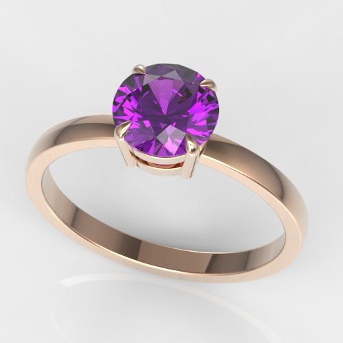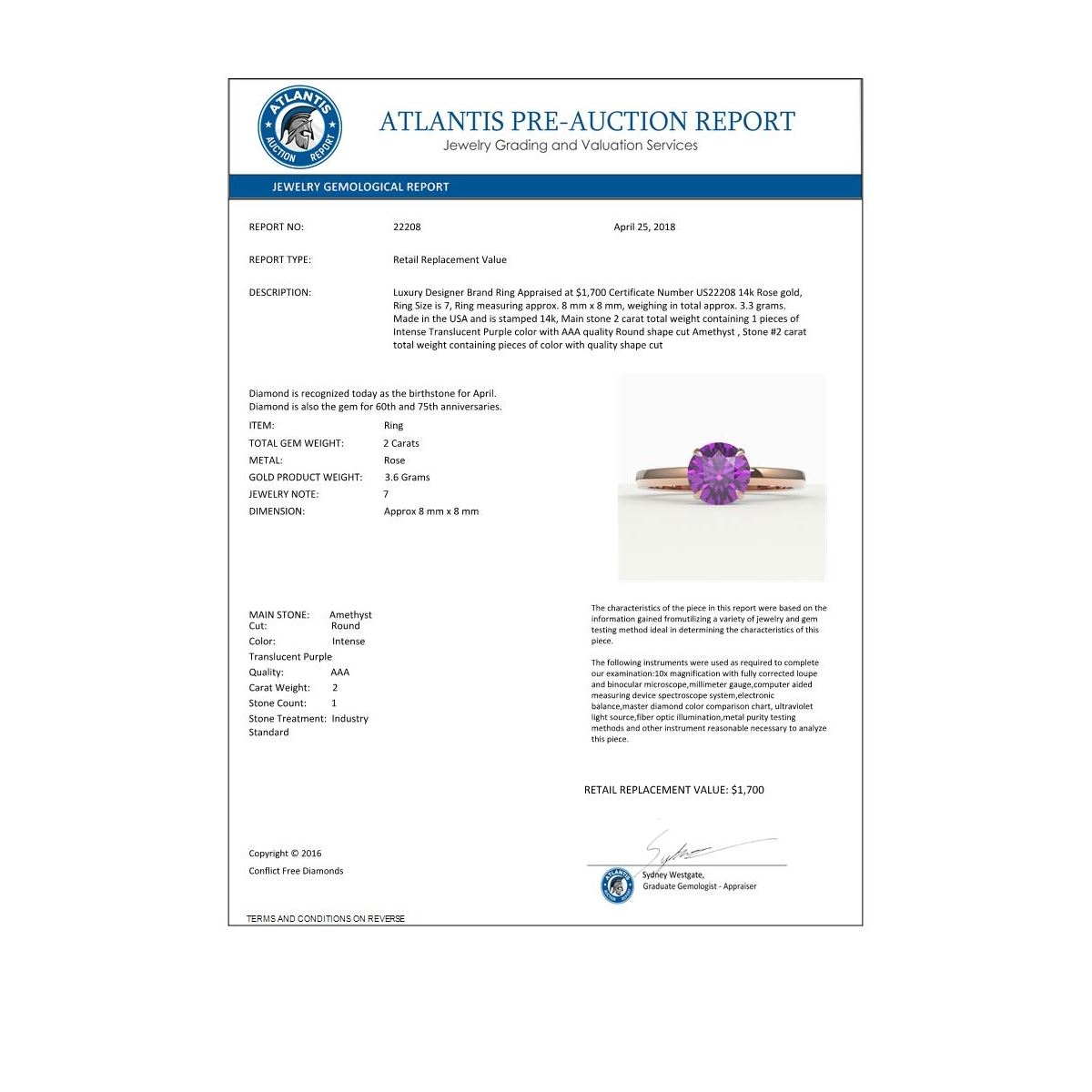 REF-25X6T -22208 ---- 2 CTW Amethyst Designer Inspired Solitaire Engagement Ring 14K Rose Gold ---- Luxury Designer Brand Ring Appraised at $1,700 Certificate Number US22208 14k Rose gold, Ring Size is 7, Ring measuring approx. 8 mm x 8 mm, weighing in total approx. 3.3 grams. Made in the USA and is stamped 14k, Main stone 2 carat total weight containing 1 pieces of Intense Translucent Purple color with AAA quality Round shape cut Amethyst , Stone #2 carat total weight containing pieces of color with quality shape cut