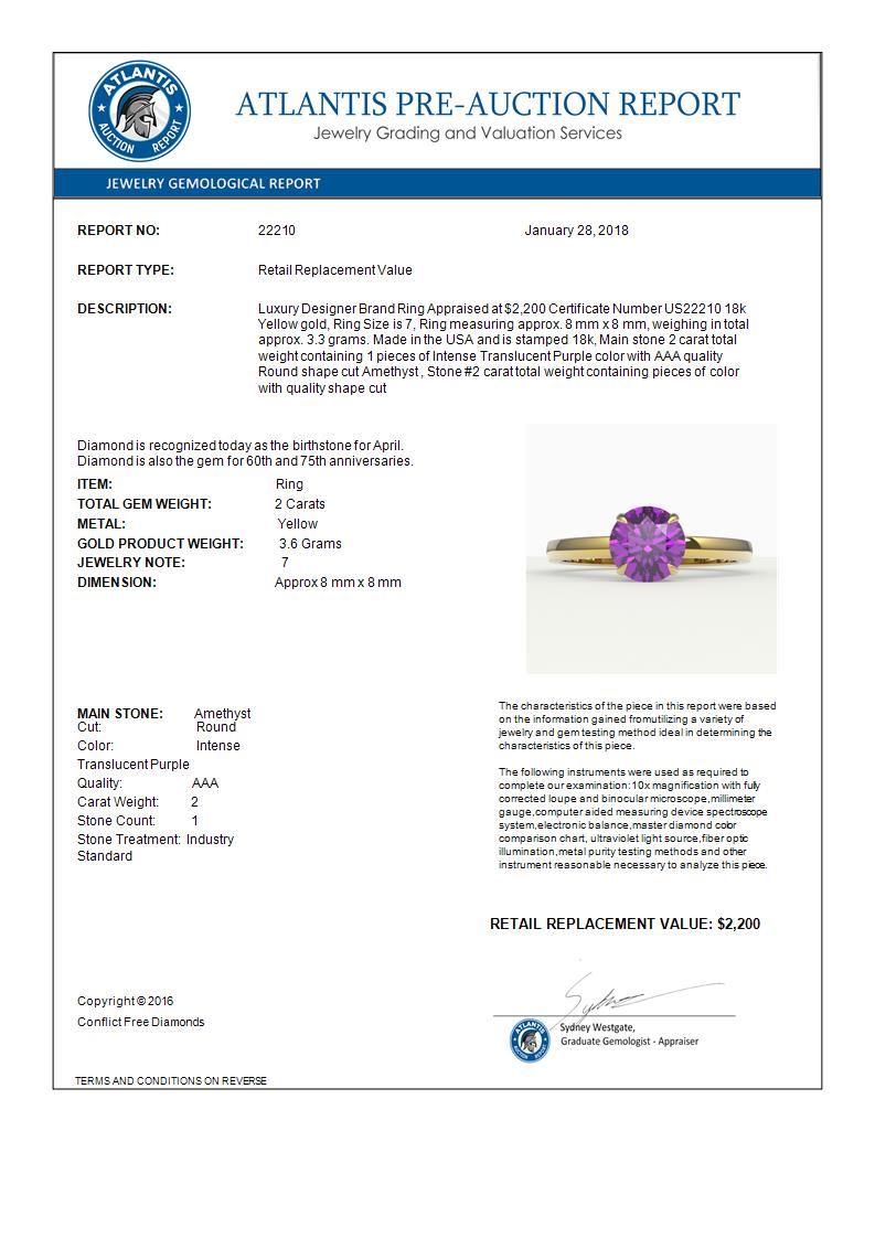 REF-33X6T -22210 ---- 2 CTW Amethyst Designer Inspired Solitaire Engagement Ring 18K Yellow Gold ---- Luxury Designer Brand Ring Appraised at $2,200 Certificate Number US22210 18k Yellow gold, Ring Size is 7, Ring measuring approx. 8 mm x 8 mm, weighing in total approx. 3.3 grams. Made in the USA and is stamped 18k, Main stone 2 carat total weight containing 1 pieces of Intense Translucent Purple color with AAA quality Round shape cut Amethyst , Stone #2 carat total weight containing pieces of color with quality shape cut
