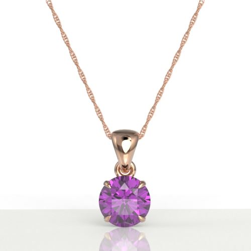 REF-24X8T -22008 ---- 2 CTW Amethyst Designer Inspired Solitaire Necklace 14K Rose Gold ---- Luxury Designer Brand Necklace Appraised at $1,650 Certificate Number US22008 14k Rose gold, Necklace Size is 16 Inches, Necklace measuring approx. 8 mm x 8 mm, weighing in total approx. 2.6 grams. Made in the USA and is stamped 14k, Main stone 2 carat total weight containing 1 pieces of Intense Translucent Purple color with AAA quality Round shape cut Amethyst , Stone #2 carat total weight containing pieces of color with quality shape cut