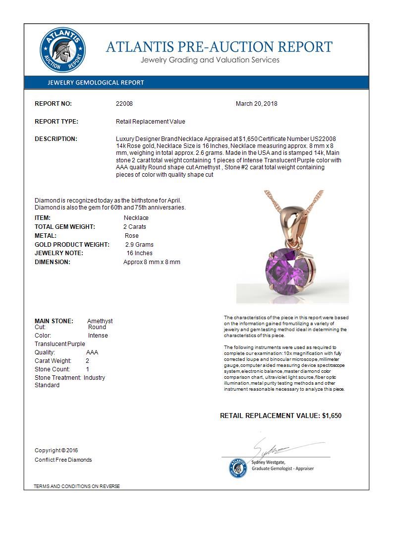 REF-24X8T -22008 ---- 2 CTW Amethyst Designer Inspired Solitaire Necklace 14K Rose Gold ---- Luxury Designer Brand Necklace Appraised at $1,650 Certificate Number US22008 14k Rose gold, Necklace Size is 16 Inches, Necklace measuring approx. 8 mm x 8 mm, weighing in total approx. 2.6 grams. Made in the USA and is stamped 14k, Main stone 2 carat total weight containing 1 pieces of Intense Translucent Purple color with AAA quality Round shape cut Amethyst , Stone #2 carat total weight containing pieces of color with quality shape cut