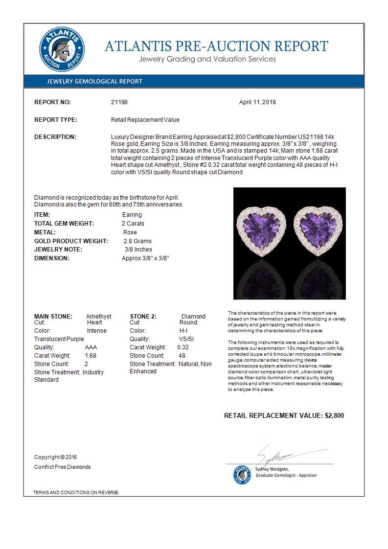 REF-42W8F -21198 ---- 2 CTW Amethyst & Micro Pave VS/SI Diamond Earrings Heart Halo 14K Rose Gold ---- Luxury Designer Brand Earring Appraised at $2,800 Certificate Number US21198 14k Rose gold, Earring Size is 3/8 Inches, Earring measuring approx. 3/8" x 3/8" , weighing in total approx. 2.5 grams. Made in the USA and is stamped 14k, Main stone 1.68 carat total weight containing 2 pieces of Intense Translucent Purple color with AAA quality Heart shape cut Amethyst , Stone #2 0.32 carat total weight containing 48 pieces of H-I color with VS/SI quality Round shape cut Diamond