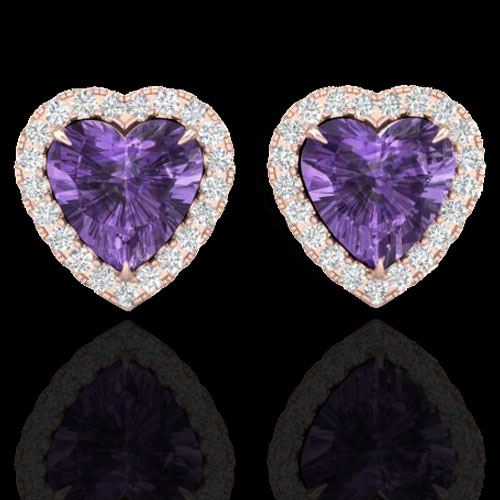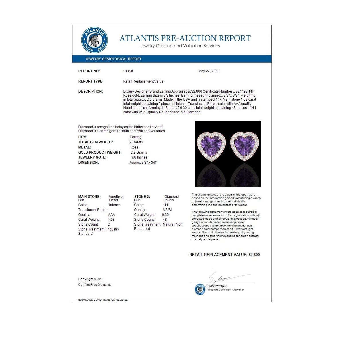 REF-42W8F -21198 ---- 2 CTW Amethyst & Micro Pave VS/SI Diamond Earrings Heart Halo 14K Rose Gold ---- Luxury Designer Brand Earring Appraised at $2,800 Certificate Number US21198 14k Rose gold, Earring Size is 3/8 Inches, Earring measuring approx. 3/8" x 3/8" , weighing in total approx. 2.5 grams. Made in the USA and is stamped 14k, Main stone 1.68 carat total weight containing 2 pieces of Intense Translucent Purple color with AAA quality Heart shape cut Amethyst , Stone #2 0.32 carat total weight containing 48 pieces of H-I color with VS/SI quality Round shape cut Diamond