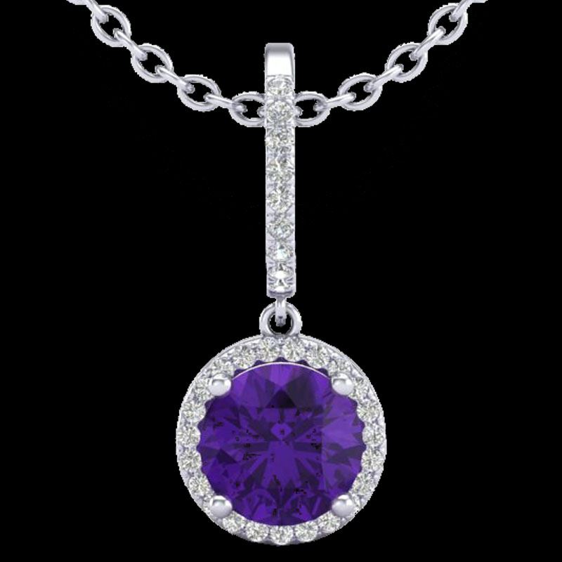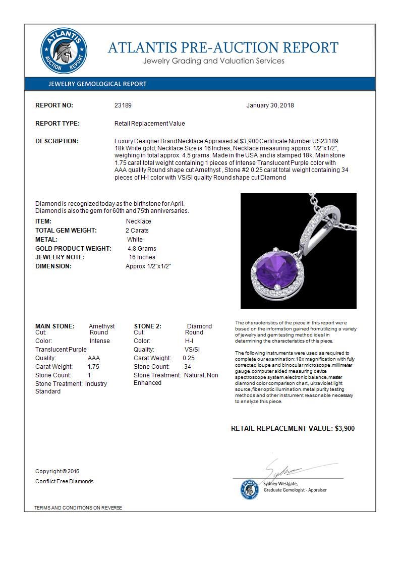 REF-54A8X -23189 ---- 2 CTW Amethyst & Micro Pave VS/SI Diamond Necklace Designer Halo 18K White Gold ---- Luxury Designer Brand Necklace Appraised at $3,900 Certificate Number US23189 18k White gold, Necklace Size is 16 Inches, Necklace measuring approx. 1/2"x1/2", weighing in total approx. 4.5 grams. Made in the USA and is stamped 18k, Main stone 1.75 carat total weight containing 1 pieces of Intense Translucent Purple color with AAA quality Round shape cut Amethyst , Stone #2 0.25 carat total weight containing 34 pieces of H-I color with VS/SI quality Round shape cut Diamond