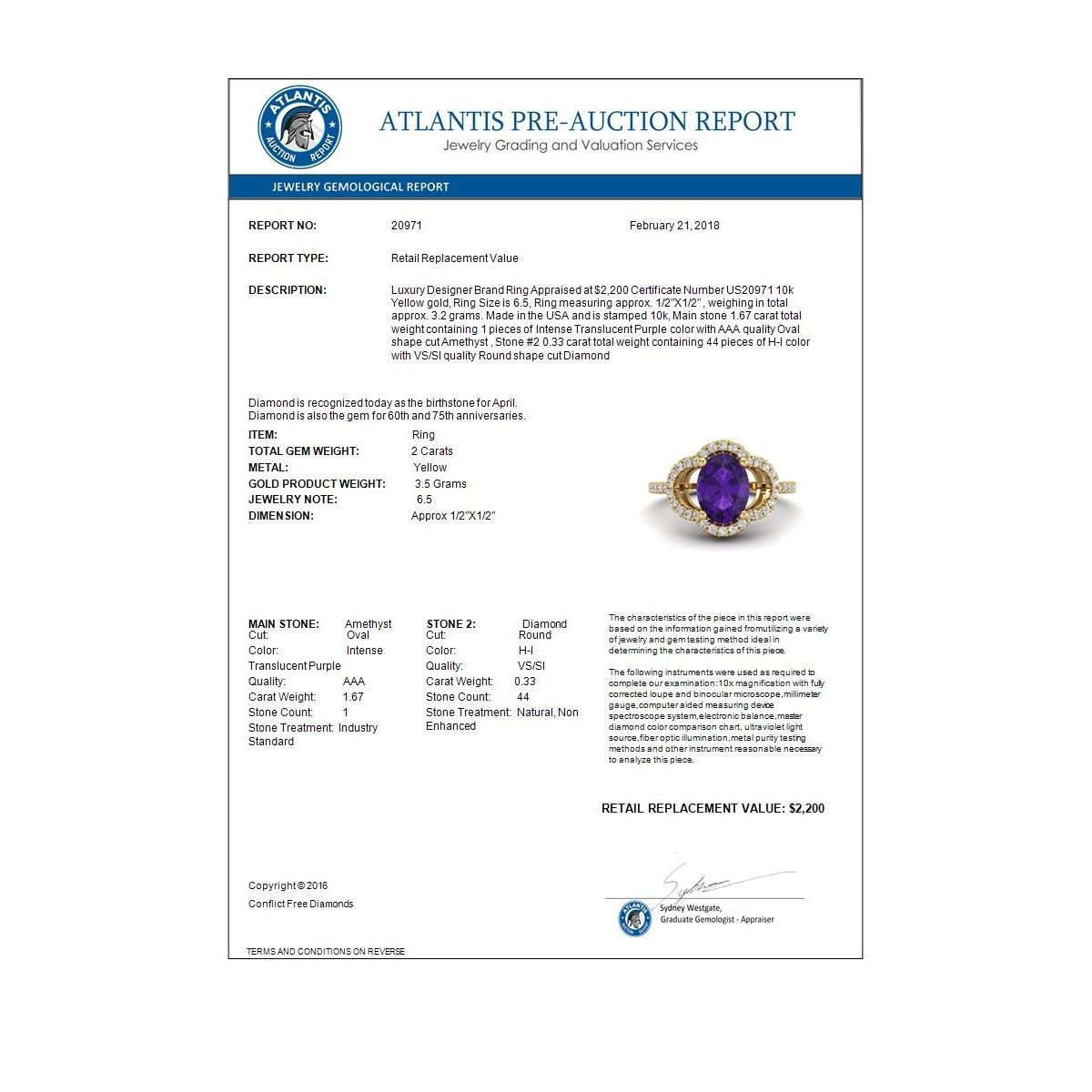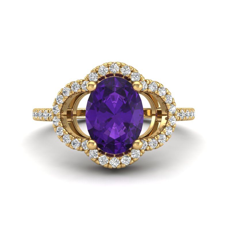 REF-33T3M -20971 ---- 2 CTW Amethyst & Micro Pave VS/SI Diamond Ring 10K Yellow Gold ---- Luxury Designer Brand Ring Appraised at $2,200 Certificate Number US20971 10k Yellow gold, Ring Size is 6.5, Ring measuring approx. 1/2"X1/2" , weighing in total approx. 3.2 grams. Made in the USA and is stamped 10k, Main stone 1.67 carat total weight containing 1 pieces of Intense Translucent Purple color with AAA quality Oval shape cut Amethyst , Stone #2 0.33 carat total weight containing 44 pieces of H-I color with VS/SI quality Round shape cut Diamond