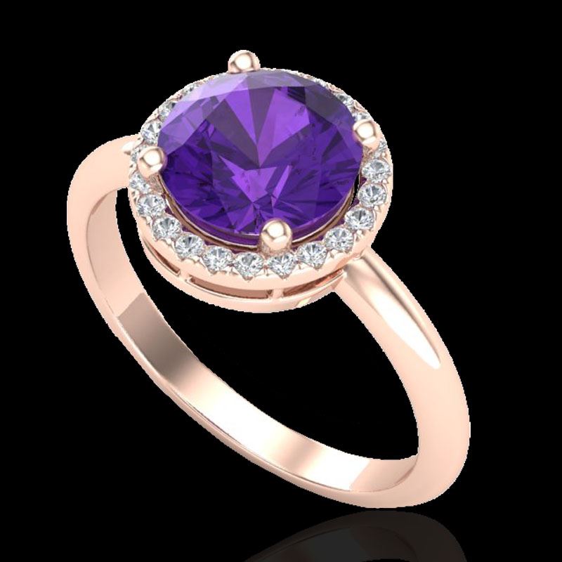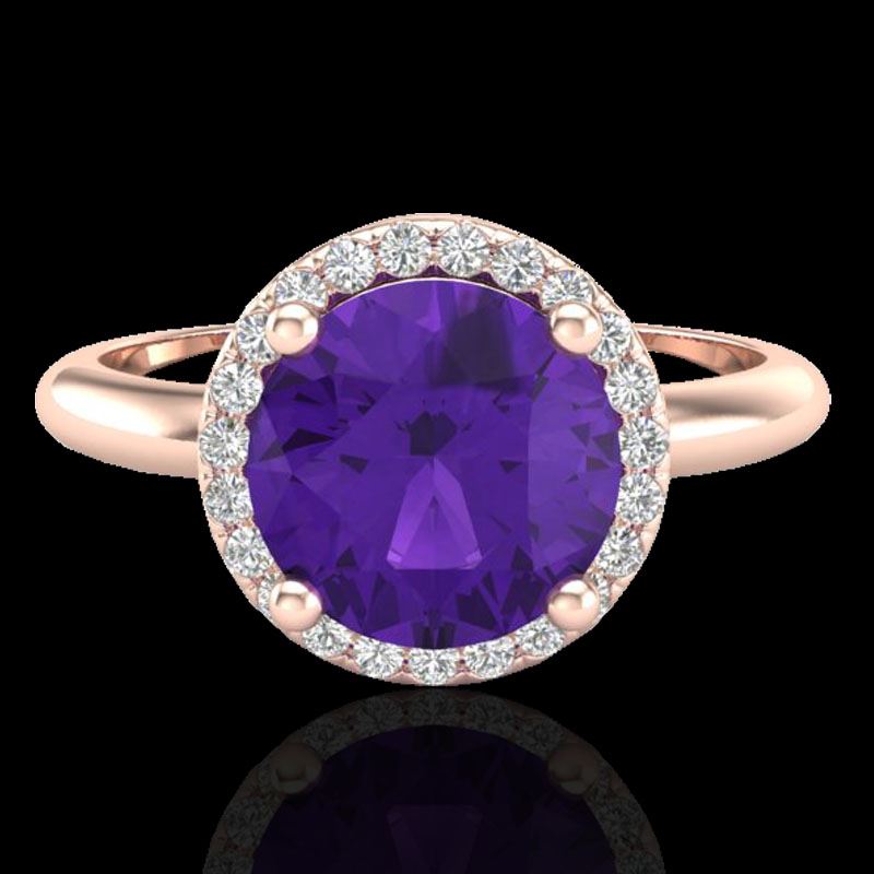 REF-44W9F -23204 ---- 2 CTW Amethyst & Micro Pave VS/SI Diamond Ring Halo 14K Rose Gold ---- Luxury Designer Brand Ring Appraised at $2,950 Certificate Number US23204 14k Rose gold, Ring Size is 6.5, Ring measuring approx. 1/2"x1/2", weighing in total approx. 4 grams. Made in the USA and is stamped 14k, Main stone 1.8 carat total weight containing 1 pieces of Intense Translucent Purple color with AAA quality Round shape cut Amethyst , Stone #2 0.2 carat total weight containing 25 pieces of H-I color with VS/SI quality Round shape cut Diamond