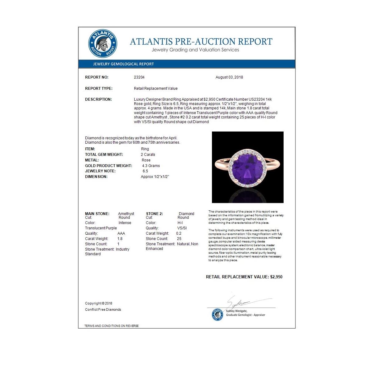 REF-44W9F -23204 ---- 2 CTW Amethyst & Micro Pave VS/SI Diamond Ring Halo 14K Rose Gold ---- Luxury Designer Brand Ring Appraised at $2,950 Certificate Number US23204 14k Rose gold, Ring Size is 6.5, Ring measuring approx. 1/2"x1/2", weighing in total approx. 4 grams. Made in the USA and is stamped 14k, Main stone 1.8 carat total weight containing 1 pieces of Intense Translucent Purple color with AAA quality Round shape cut Amethyst , Stone #2 0.2 carat total weight containing 25 pieces of H-I color with VS/SI quality Round shape cut Diamond