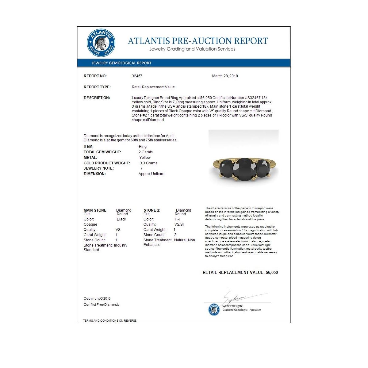 REF-91F8N -32467 ---- 2 CTW Black Diamond Past Present Future Designer Ring 18K Yellow Gold ---- Luxury Designer Brand Ring Appraised at $6,050 Certificate Number US32467 18k Yellow gold, Ring Size is 7, Ring measuring approx. Uniform, weighing in total approx. 3 grams. Made in the USA and is stamped 18k, Main stone 1 carat total weight containing 1 pieces of Black Opaque color with VS quality Round shape cut Diamond , Stone #2 1 carat total weight containing 2 pieces of H-I color with VS/SI quality Round shape cut Diamond
