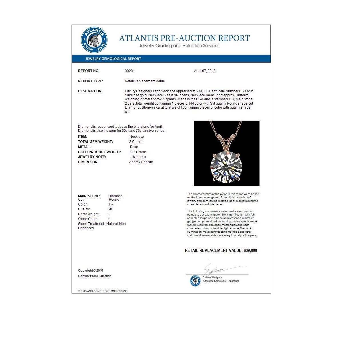 REF-585F2N -33231 ---- 2 CTW Certified H-SI/I Quality Diamond Solitaire Necklace 10K Rose Gold ---- Luxury Designer Brand Necklace Appraised at $39,000 Certificate Number US33231 10k Rose gold, Necklace Size is 16 Incehs, Necklace measuring approx. Uniform, weighing in total approx. 2 grams. Made in the USA and is stamped 10k, Main stone 2 carat total weight containing 1 pieces of H-I color with SI/I quality Round shape cut Diamond , Stone #2 carat total weight containing pieces of color with quality shape cut