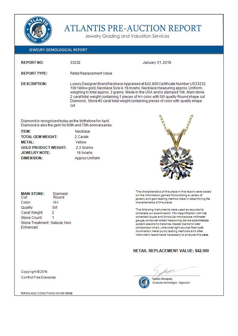 REF-585H2A -33232 ---- 2 CTW Certified H-SI/I Quality Diamond Solitaire Necklace 10K Yellow Gold ---- Luxury Designer Brand Necklace Appraised at $42,900 Certificate Number US33232 10k Yellow gold, Necklace Size is 16 Incehs, Necklace measuring approx. Uniform, weighing in total approx. 2 grams. Made in the USA and is stamped 10k, Main stone 2 carat total weight containing 1 pieces of H-I color with SI/I quality Round shape cut Diamond , Stone #2 carat total weight containing pieces of color with quality shape cut