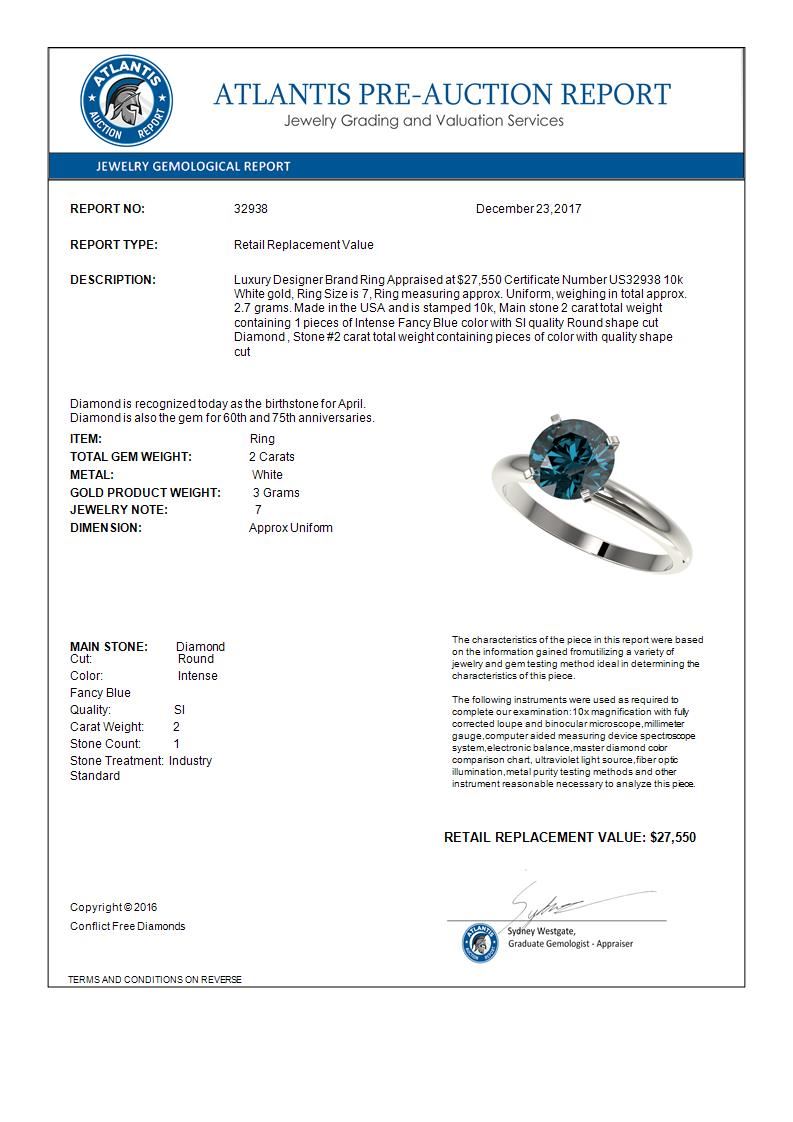REF-417W6F -32938 ---- 2 CTW Certified Intense Blue SI Diamond Solitaire Engagement Ring 10K White Gold ---- Luxury Designer Brand Ring Appraised at $27,550 Certificate Number US32938 10k White gold, Ring Size is 7, Ring measuring approx. Uniform, weighing in total approx. 2.7 grams. Made in the USA and is stamped 10k, Main stone 2 carat total weight containing 1 pieces of Intense Fancy Blue color with SI quality Round shape cut Diamond , Stone #2 carat total weight containing pieces of color with quality shape cut