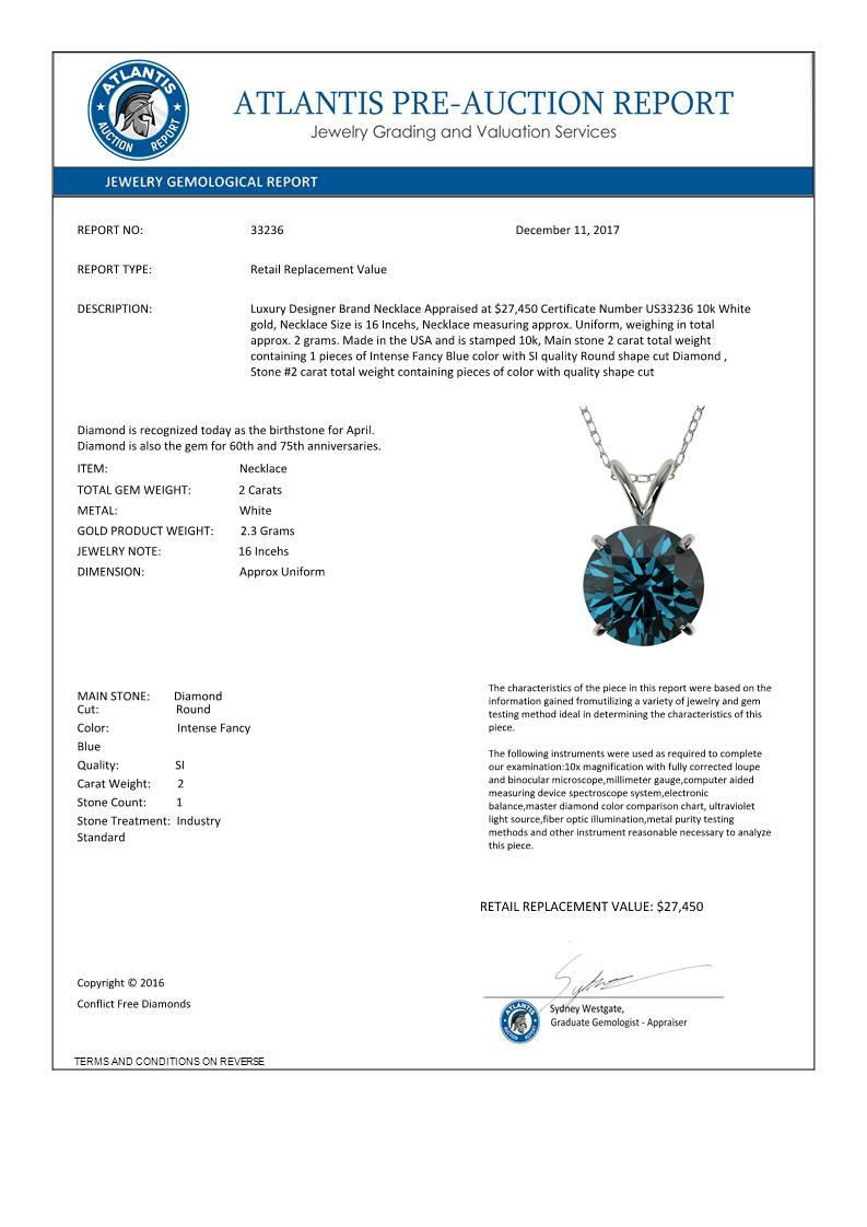 REF-343W2F -33236 ---- 2 CTW Certified Intense Blue SI Diamond Solitaire Necklace 10K White Gold ---- Luxury Designer Brand Necklace Appraised at $27,450 Certificate Number US33236 10k White gold, Necklace Size is 16 Incehs, Necklace measuring approx. Uniform, weighing in total approx. 2 grams. Made in the USA and is stamped 10k, Main stone 2 carat total weight containing 1 pieces of Intense Fancy Blue color with SI quality Round shape cut Diamond , Stone #2 carat total weight containing pieces of color with quality shape cut