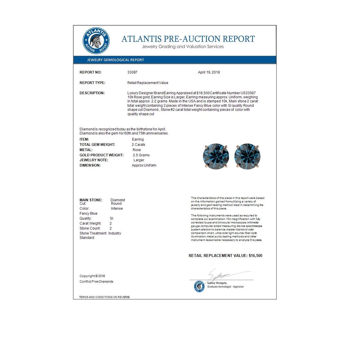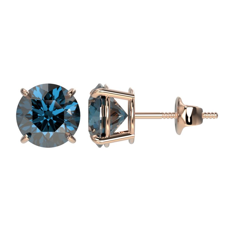 REF-205A9X -33087 ---- 2 CTW Certified Intense Blue SI Diamond Solitaire Stud Earrings 10K Rose Gold ---- Luxury Designer Brand Earring Appraised at $16,500 Certificate Number US33087 10k Rose gold, Earring Size is Larger, Earring measuring approx. Uniform, weighing in total approx. 2.2 grams. Made in the USA and is stamped 10k, Main stone 2 carat total weight containing 2 pieces of Intense Fancy Blue color with SI quality Round shape cut Diamond , Stone #2 carat total weight containing pieces of color with quality shape cut
