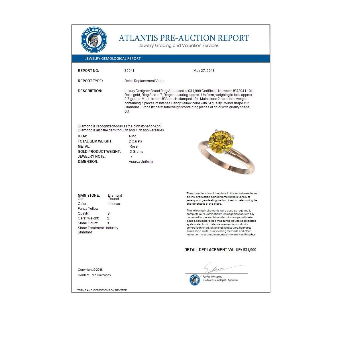 REF-527A3X -32941 ---- 2 CTW Certified Intense Yellow SI Diamond Solitaire Engagement Ring 10K Rose Gold ---- Luxury Designer Brand Ring Appraised at $31,900 Certificate Number US32941 10k Rose gold, Ring Size is 7, Ring measuring approx. Uniform, weighing in total approx. 2.7 grams. Made in the USA and is stamped 10k, Main stone 2 carat total weight containing 1 pieces of Intense Fancy Yellow color with SI quality Round shape cut Diamond , Stone #2 carat total weight containing pieces of color with quality shape cut
