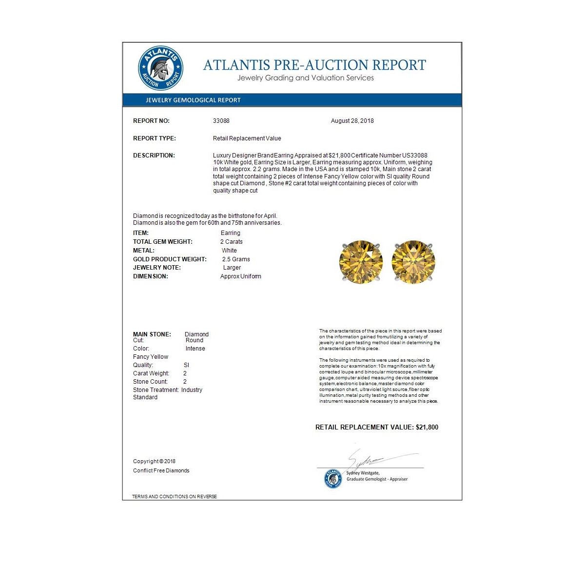 REF-297A2X -33088 ---- 2 CTW Certified Intense Yellow SI Diamond Solitaire Stud Earrings 10K White Gold ---- Luxury Designer Brand Earring Appraised at $21,800 Certificate Number US33088 10k White gold, Earring Size is Larger, Earring measuring approx. Uniform, weighing in total approx. 2.2 grams. Made in the USA and is stamped 10k, Main stone 2 carat total weight containing 2 pieces of Intense Fancy Yellow color with SI quality Round shape cut Diamond , Stone #2 carat total weight containing pieces of color with quality shape cut
