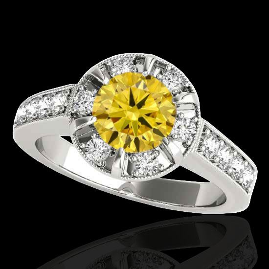 REF-236M4H -34493 ---- 2 CTW Certified Si/I Fancy Intense Yellow Diamond Solitaire Halo Ring 10K White Gold ---- Luxury Designer Brand Ring Appraised at $14,300 Certificate Number US34493 10k White gold, Ring Size is 7, Ring measuring approx. Uniform, weighing in total approx. 5 grams. Made in the USA and is stamped 10k, Main stone 1.28 carat total weight containing 1 pieces of Intense Fancy Yellow color with SI quality Round shape cut Diamond , Stone #2 0.72 carat total weight containing 14 pieces of H-I color with VS/SI quality Round shape cut Diamond