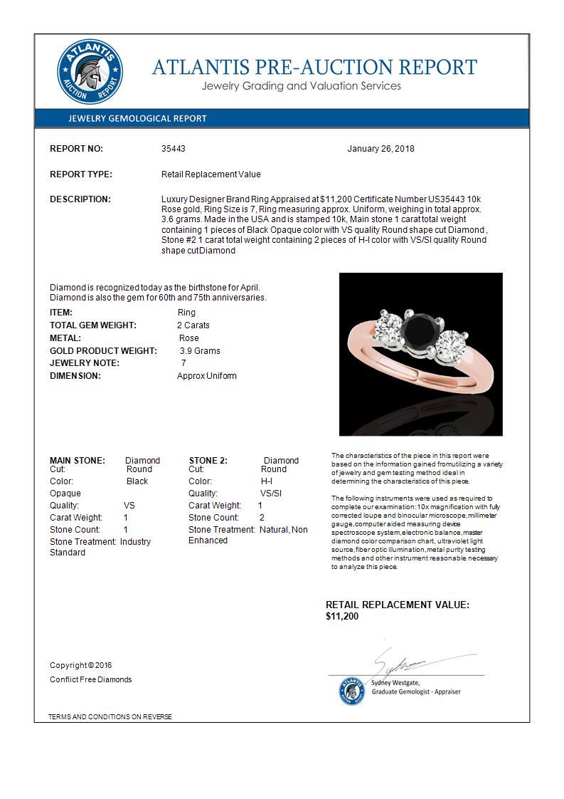REF-185T5M -35443 ---- 2 CTW Certified VS Black Diamond 3 Stone Solitaire Ring 10K Rose Gold ---- Luxury Designer Brand Ring Appraised at $11,200 Certificate Number US35443 10k Rose gold, Ring Size is 7, Ring measuring approx. Uniform, weighing in total approx. 3.6 grams. Made in the USA and is stamped 10k, Main stone 1 carat total weight containing 1 pieces of Black Opaque color with VS quality Round shape cut Diamond , Stone #2 1 carat total weight containing 2 pieces of H-I color with VS/SI quality Round shape cut Diamond