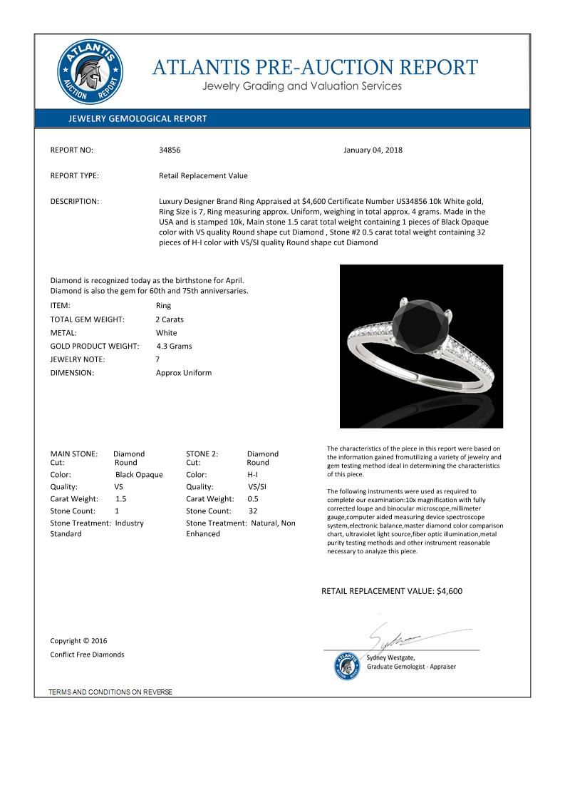 REF-76W4F -34856 ---- 2 CTW Certified VS Black Diamond Solitaire Ring 10K White Gold ---- Luxury Designer Brand Ring Appraised at $4,600 Certificate Number US34856 10k White gold, Ring Size is 7, Ring measuring approx. Uniform, weighing in total approx. 4 grams. Made in the USA and is stamped 10k, Main stone 1.5 carat total weight containing 1 pieces of Black Opaque color with VS quality Round shape cut Diamond , Stone #2 0.5 carat total weight containing 32 pieces of H-I color with VS/SI quality Round shape cut Diamond
