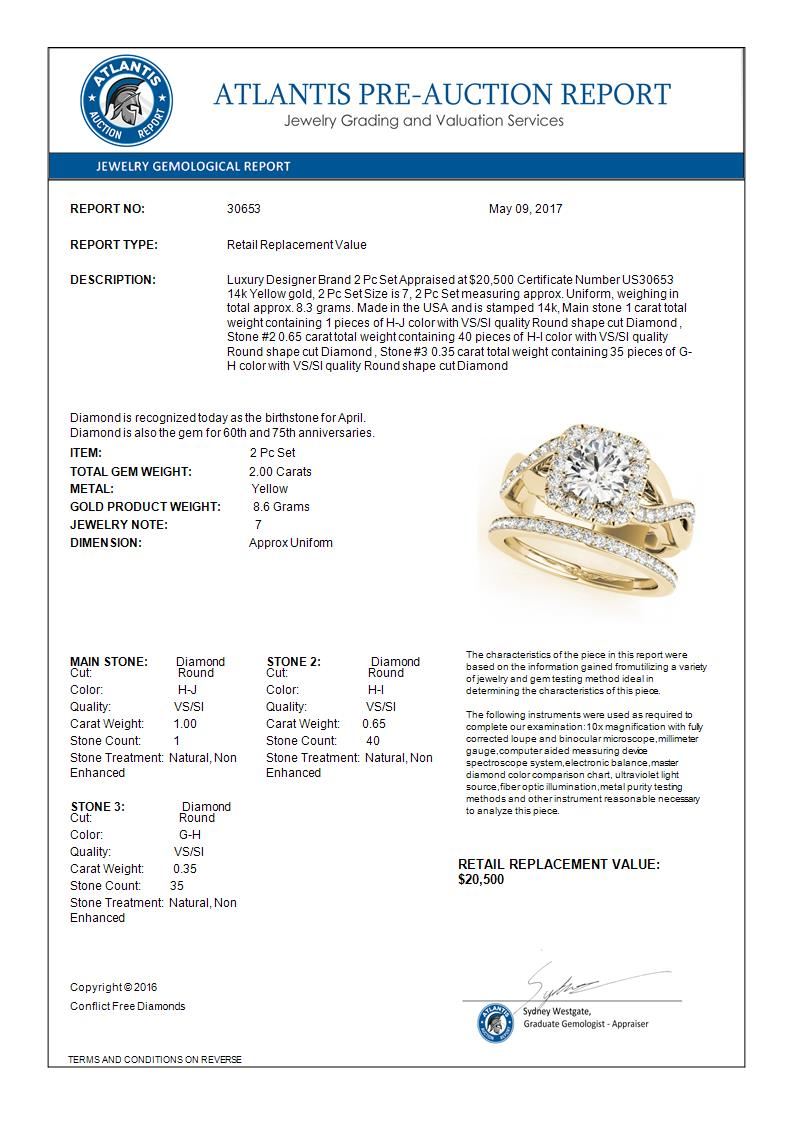 2 CTW Certified VS/SI Diamond 2Pc Wedding Set Solitaire Halo 14K Yellow Gold ---- Luxury Designer Brand 2 Pc Set Appraised Retail Price at $20,500 ---- SKU Number US30653 14k Yellow gold 2 Pc Set Size is 7, 2 Pc Set measuring approx. Uniform, weighing in total approx. 8.3 grams. Made in the USA and is stamped 14k, Main stone 1.00 carat total weight containing 1 pieces of H-J color with VS/SI quality Round shape cut Diamond , Stone #2 0.65 carat total weight containing 40 pieces of H-I color with VS/SI quality Round shape cut