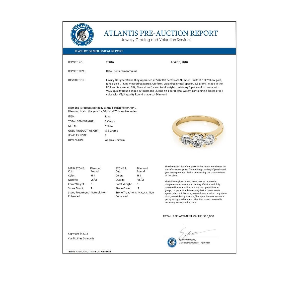 REF-448N5Y -28016 ---- 2 CTW Certified VS/SI Diamond 3 Stone Solitaire Ring 18K Yellow Gold ---- Luxury Designer Brand Ring Appraised at $26,900 Certificate Number US28016 18k Yellow gold, Ring Size is 7, Ring measuring approx. Uniform, weighing in total approx. 5.3 grams. Made in the USA and is stamped 18k, Main stone 1 carat total weight containing 1 pieces of H-J color with VS/SI quality Round shape cut Diamond , Stone #2 1 carat total weight containing 2 pieces of H-I color with VS/SI quality Round shape cut Diamond