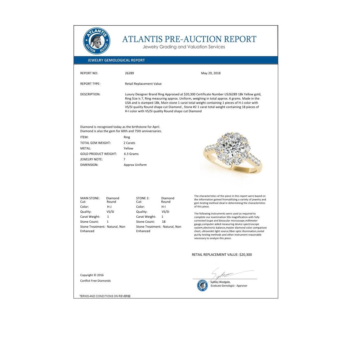 REF-410M2H -26289 ---- 2 CTW Certified VS/SI Diamond Solitaire Halo Ring 18K Yellow Gold ---- Luxury Designer Brand Ring Appraised at $20,300 Certificate Number US26289 18k Yellow gold, Ring Size is 7, Ring measuring approx. Uniform, weighing in total approx. 6 grams. Made in the USA and is stamped 18k, Main stone 1 carat total weight containing 1 pieces of H-J color with VS/SI quality Round shape cut Diamond , Stone #2 1 carat total weight containing 18 pieces of H-I color with VS/SI quality Round shape cut Diamond