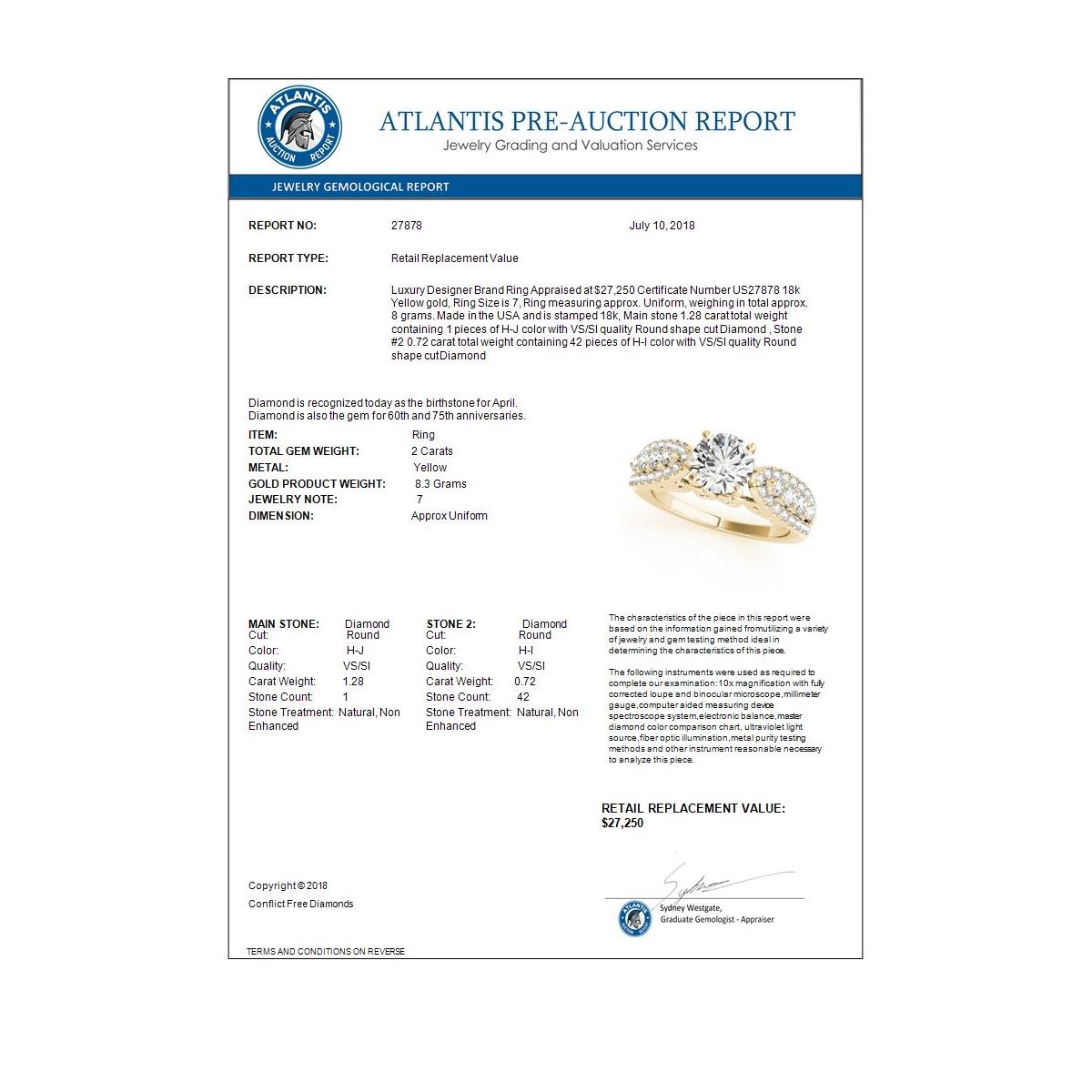 REF-481M8H -27878 ---- 2 CTW Certified VS/SI Diamond Solitaire Ring 18K Yellow Gold ---- Luxury Designer Brand Ring Appraised at $27,250 Certificate Number US27878 18k Yellow gold, Ring Size is 7, Ring measuring approx. Uniform, weighing in total approx. 8 grams. Made in the USA and is stamped 18k, Main stone 1.28 carat total weight containing 1 pieces of H-J color with VS/SI quality Round shape cut Diamond , Stone #2 0.72 carat total weight containing 42 pieces of H-I color with VS/SI quality Round shape cut Diamond