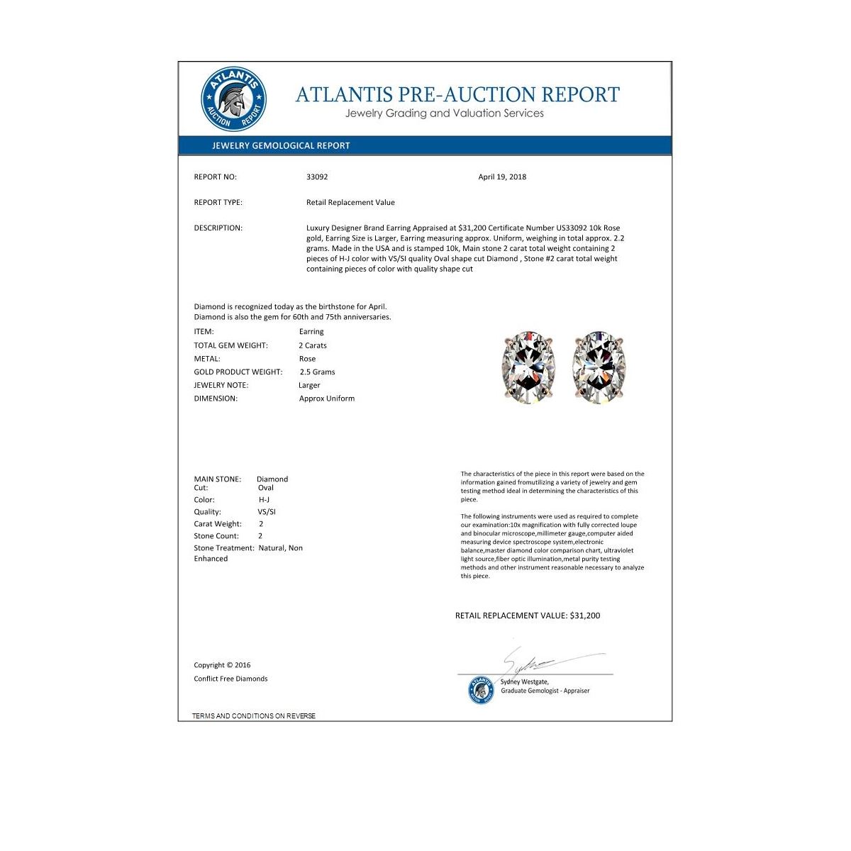 REF-585M2H -33092 ---- 2 CTW Certified VS/SI Quality Oval Diamond Solitaire Stud Earrings 10K Rose Gold ---- Luxury Designer Brand Earring Appraised at $31,200 Certificate Number US33092 10k Rose gold, Earring Size is Larger, Earring measuring approx. Uniform, weighing in total approx. 2.2 grams. Made in the USA and is stamped 10k, Main stone 2 carat total weight containing 2 pieces of H-J color with VS/SI quality Oval shape cut Diamond , Stone #2 carat total weight containing pieces of color with quality shape cut