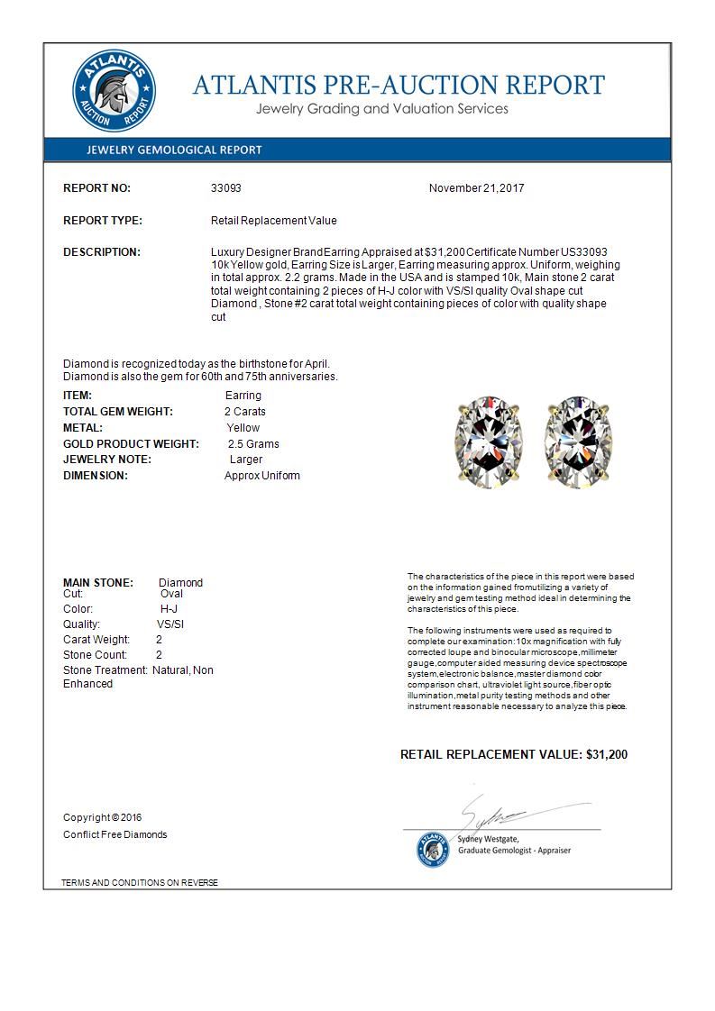 REF-585X2T -33093 ---- 2 CTW Certified VS/SI Quality Oval Diamond Solitaire Stud Earrings 10K Yellow Gold ---- Luxury Designer Brand Earring Appraised at $31,200 Certificate Number US33093 10k Yellow gold, Earring Size is Larger, Earring measuring approx. Uniform, weighing in total approx. 2.2 grams. Made in the USA and is stamped 10k, Main stone 2 carat total weight containing 2 pieces of H-J color with VS/SI quality Oval shape cut Diamond , Stone #2 carat total weight containing pieces of color with quality shape cut