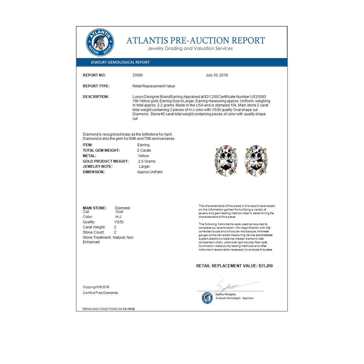 REF-585X2T -33093 ---- 2 CTW Certified VS/SI Quality Oval Diamond Solitaire Stud Earrings 10K Yellow Gold ---- Luxury Designer Brand Earring Appraised at $31,200 Certificate Number US33093 10k Yellow gold, Earring Size is Larger, Earring measuring approx. Uniform, weighing in total approx. 2.2 grams. Made in the USA and is stamped 10k, Main stone 2 carat total weight containing 2 pieces of H-J color with VS/SI quality Oval shape cut Diamond , Stone #2 carat total weight containing pieces of color with quality shape cut