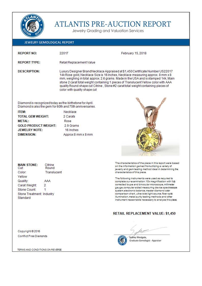 REF-24M4H -22017 ---- 2 CTW Citrine Designer Inspired Solitaire Necklace 14K Rose Gold ---- Luxury Designer Brand Necklace Appraised at $1,450 Certificate Number US22017 14k Rose gold, Necklace Size is 16 Inches, Necklace measuring approx. 8 mm x 8 mm, weighing in total approx. 2.6 grams. Made in the USA and is stamped 14k, Main stone 2 carat total weight containing 1 pieces of Translucent Yellow color with AAA quality Round shape cut Citrine , Stone #2 carat total weight containing pieces of color with quality shape cut