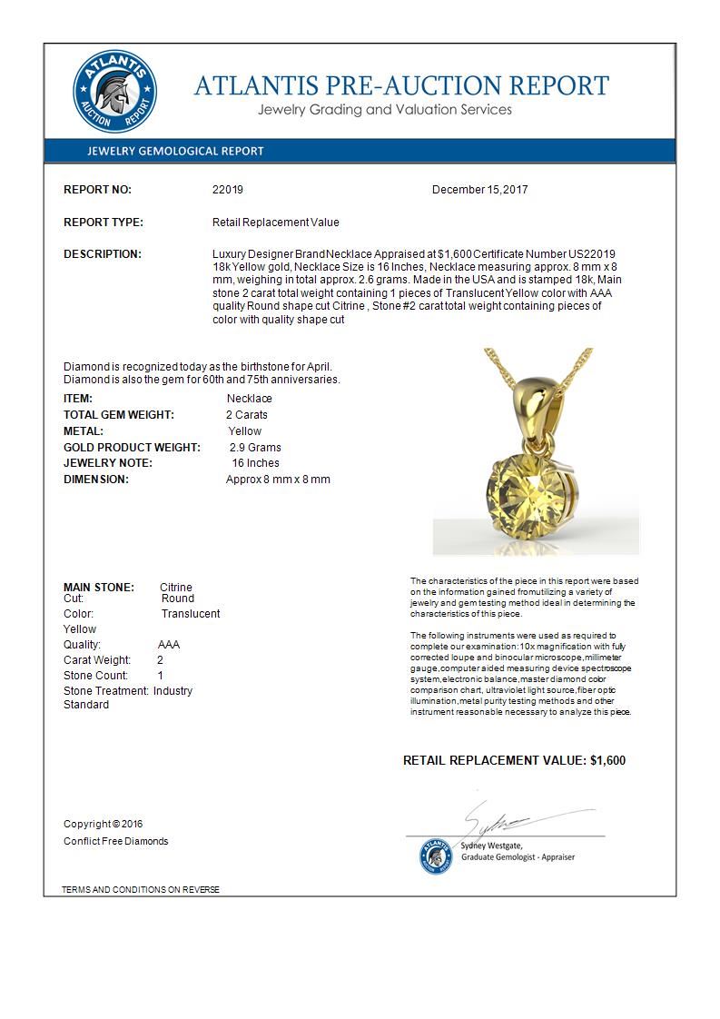 REF-26K2W -22019 ---- 2 CTW Citrine Designer Inspired Solitaire Necklace 18K Yellow Gold ---- Luxury Designer Brand Necklace Appraised at $1,600 Certificate Number US22019 18k Yellow gold, Necklace Size is 16 Inches, Necklace measuring approx. 8 mm x 8 mm, weighing in total approx. 2.6 grams. Made in the USA and is stamped 18k, Main stone 2 carat total weight containing 1 pieces of Translucent Yellow color with AAA quality Round shape cut Citrine , Stone #2 carat total weight containing pieces of color with quality shape cut
