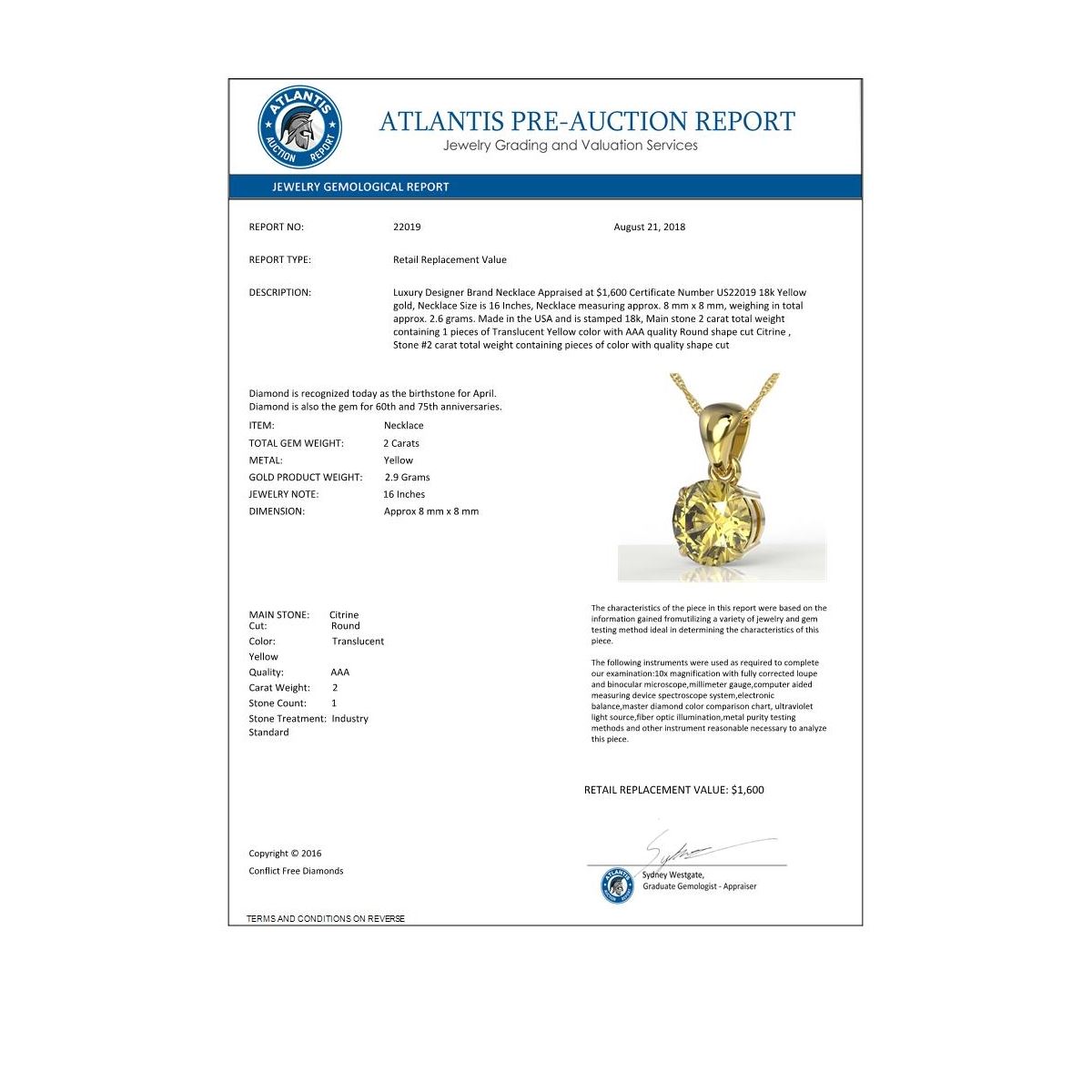 REF-26K2W -22019 ---- 2 CTW Citrine Designer Inspired Solitaire Necklace 18K Yellow Gold ---- Luxury Designer Brand Necklace Appraised at $1,600 Certificate Number US22019  18k Yellow gold,  Necklace Size is 16 Inches, Necklace measuring approx. 8 mm x 8 mm, weighing in total approx. 2.6 grams. Made in the USA and is stamped 18k, Main stone 2 carat total weight containing 1 pieces of Translucent Yellow color with AAA quality Round shape cut Citrine , Stone #2  carat total weight containing  pieces of  color with quality  shape cut