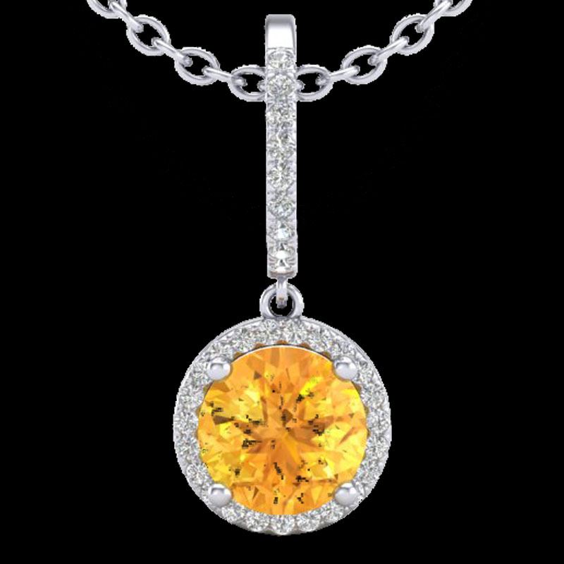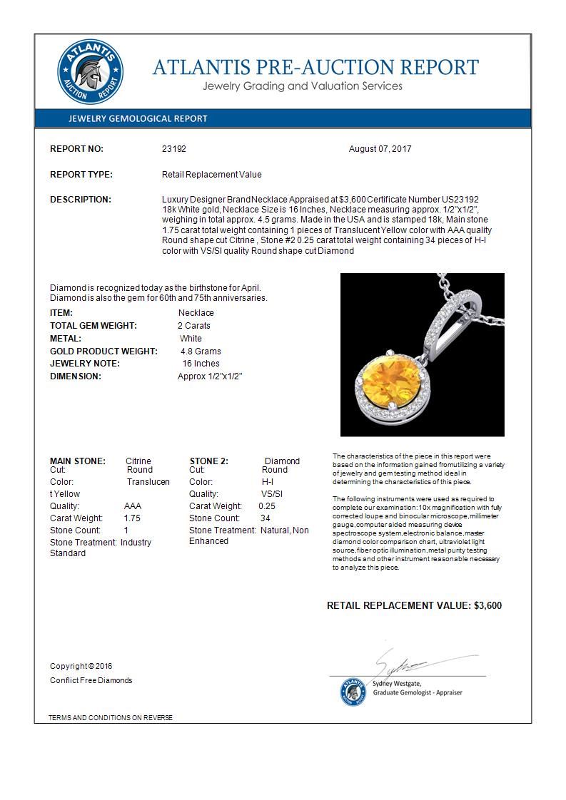 23192 - REF-54M7F ---- 2 CTW Citrine & Micro Pave VS/SI Diamond Necklace Designer Halo 18K White Gold ---- Luxury Designer Brand Necklace Appraised at $3,600 Certificate Number US23192 18k White gold, Necklace Size is 16 Inches, Necklace measuring approx. 1/2"x1/2", weighing in total approx. 4.5 grams. Made in the USA and is stamped 18k, Main stone 1.75 carat total weight containing 1 pieces of Translucent Yellow color with AAA quality Round shape cut Citrine , Stone #2 0.25 carat total weight containing 34 pieces of H-I color with VS/SI quality Round shape cut Diamond
