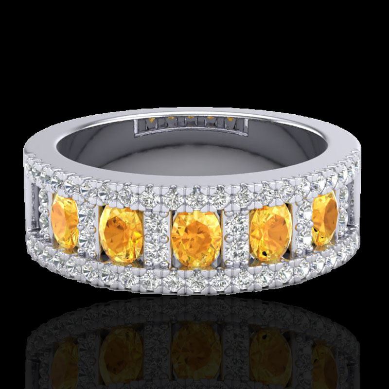 REF-61K8W -20822 ---- 2 CTW Citrine & Micro VS/SI Diamond Inspired Ring 10K White Gold ---- Luxury Designer Brand Ring Appraised at $4,100 Certificate Number US20822 10k White gold, Ring Size is 7, Ring measuring approx. 3/8 " X1 ", weighing in total approx. 5 grams. Made in the USA and is stamped 10k, Main stone 1.36 carat total weight containing 5 pieces of Translucent Yellow color with AAA quality Oval shape cut Citrine , Stone #2 0.64 carat total weight containing 50 pieces of H-I color with VS/SI quality Round shape cut Diamond