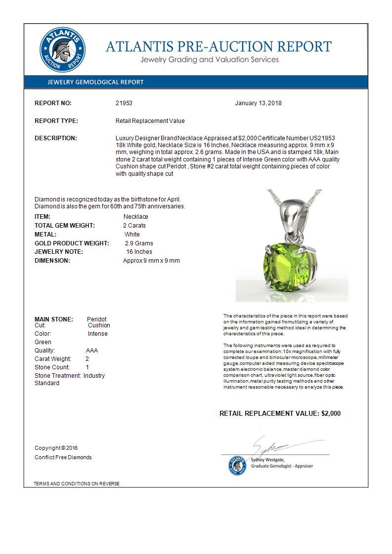 REF-28T2M -21953 ---- 2 CTW Cushion Cut Peridot Designer Solitaire Necklace 18K White Gold ---- Luxury Designer Brand Necklace Appraised at $2,000 Certificate Number US21953 18k White gold, Necklace Size is 16 Inches, Necklace measuring approx. 9 mm x 9 mm, weighing in total approx. 2.6 grams. Made in the USA and is stamped 18k, Main stone 2 carat total weight containing 1 pieces of Intense Green color with AAA quality Cushion shape cut Peridot , Stone #2 carat total weight containing pieces of color with quality shape cut