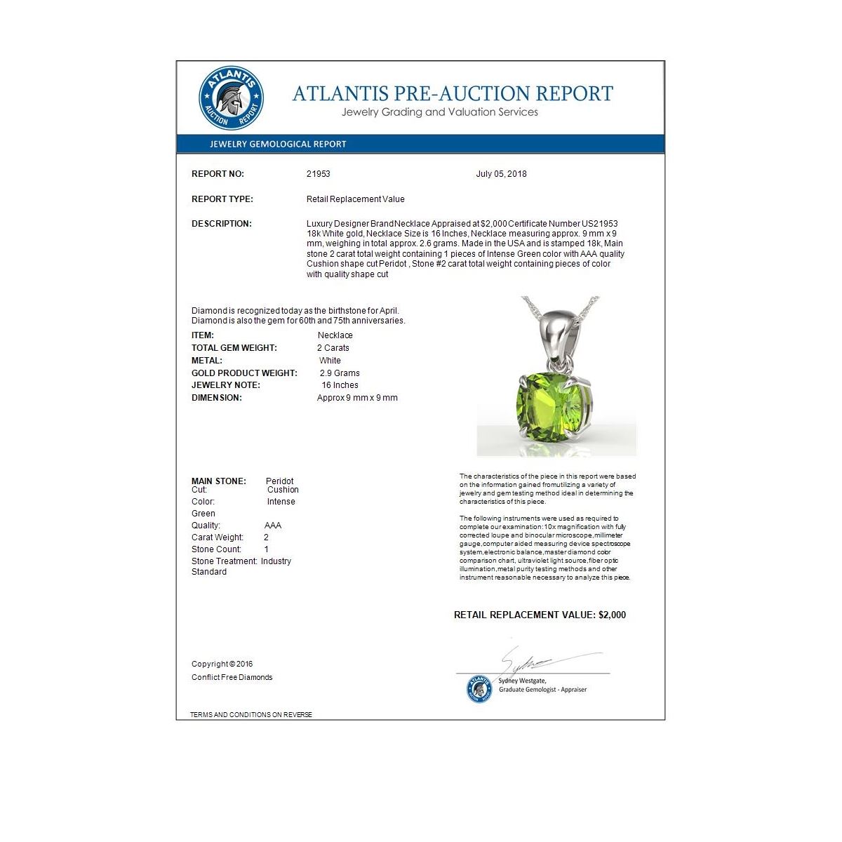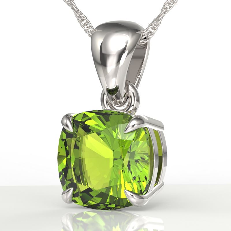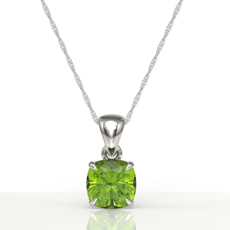 REF-28T2M -21953 ---- 2 CTW Cushion Cut Peridot Designer Solitaire Necklace 18K White Gold ---- Luxury Designer Brand Necklace Appraised at $2,000 Certificate Number US21953  18k White gold,  Necklace Size is 16 Inches, Necklace measuring approx. 9 mm x 9 mm, weighing in total approx. 2.6 grams. Made in the USA and is stamped 18k, Main stone 2 carat total weight containing 1 pieces of Intense Green color with AAA quality Cushion shape cut Peridot , Stone #2  carat total weight containing  pieces of  color with quality  shape cut