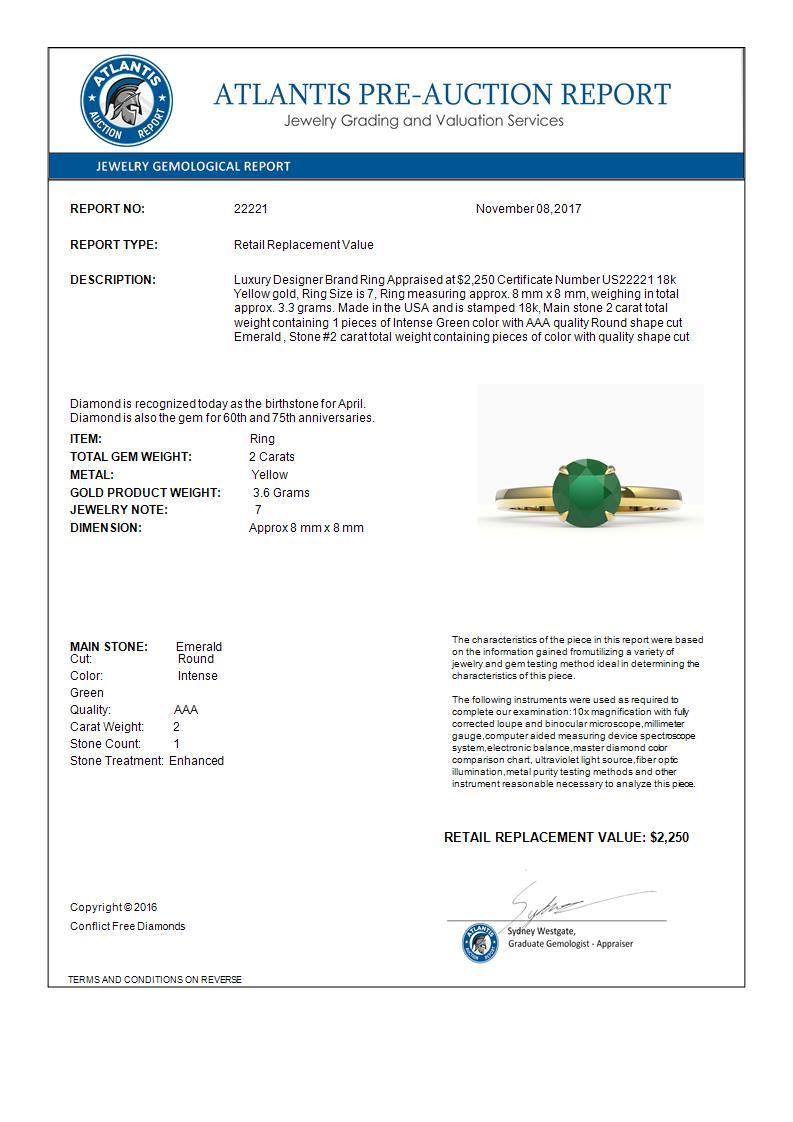 REF-34A2X -22221 ---- 2 CTW Emerald Designer Inspired Solitaire Engagement Ring 18K Yellow Gold ---- Luxury Designer Brand Ring Appraised at $2,250 Certificate Number US22221 18k Yellow gold, Ring Size is 7, Ring measuring approx. 8 mm x 8 mm, weighing in total approx. 3.3 grams. Made in the USA and is stamped 18k, Main stone 2 carat total weight containing 1 pieces of Intense Green color with AAA quality Round shape cut Emerald , Stone #2 carat total weight containing pieces of color with quality shape cut