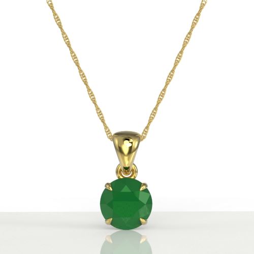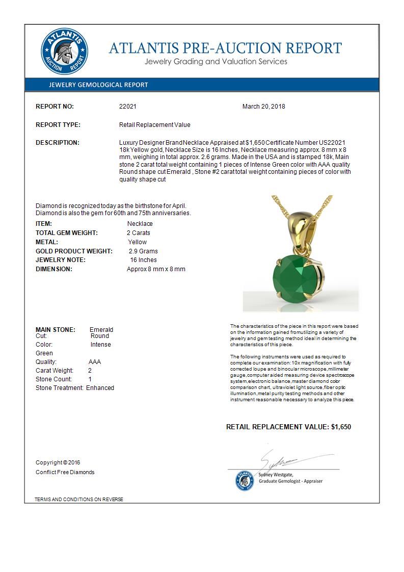 REF-24Y9K -22021 ---- 2 CTW Emerald Designer Inspired Solitaire Necklace 18K Yellow Gold ---- Luxury Designer Brand Necklace Appraised at $1,650 Certificate Number US22021 18k Yellow gold, Necklace Size is 16 Inches, Necklace measuring approx. 8 mm x 8 mm, weighing in total approx. 2.6 grams. Made in the USA and is stamped 18k, Main stone 2 carat total weight containing 1 pieces of Intense Green color with AAA quality Round shape cut Emerald , Stone #2 carat total weight containing pieces of color with quality shape cut