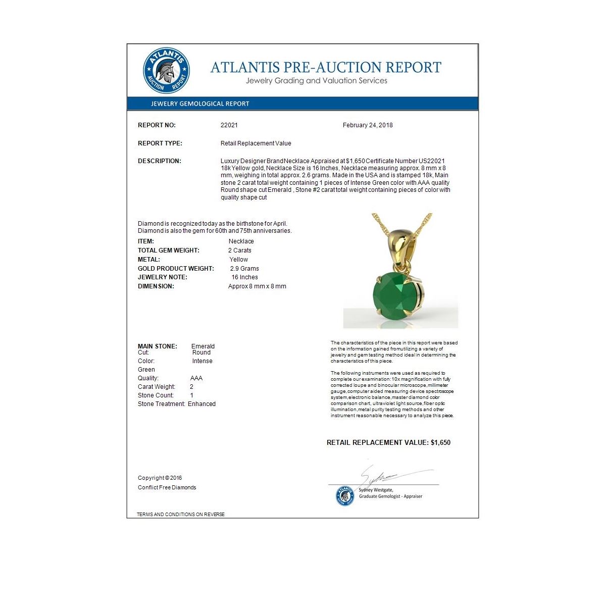 REF-24Y9K -22021 ---- 2 CTW Emerald Designer Inspired Solitaire Necklace 18K Yellow Gold ---- Luxury Designer Brand Necklace Appraised at $1,650 Certificate Number US22021 18k Yellow gold, Necklace Size is 16 Inches, Necklace measuring approx. 8 mm x 8 mm, weighing in total approx. 2.6 grams. Made in the USA and is stamped 18k, Main stone 2 carat total weight containing 1 pieces of Intense Green color with AAA quality Round shape cut Emerald , Stone #2 carat total weight containing pieces of color with quality shape cut