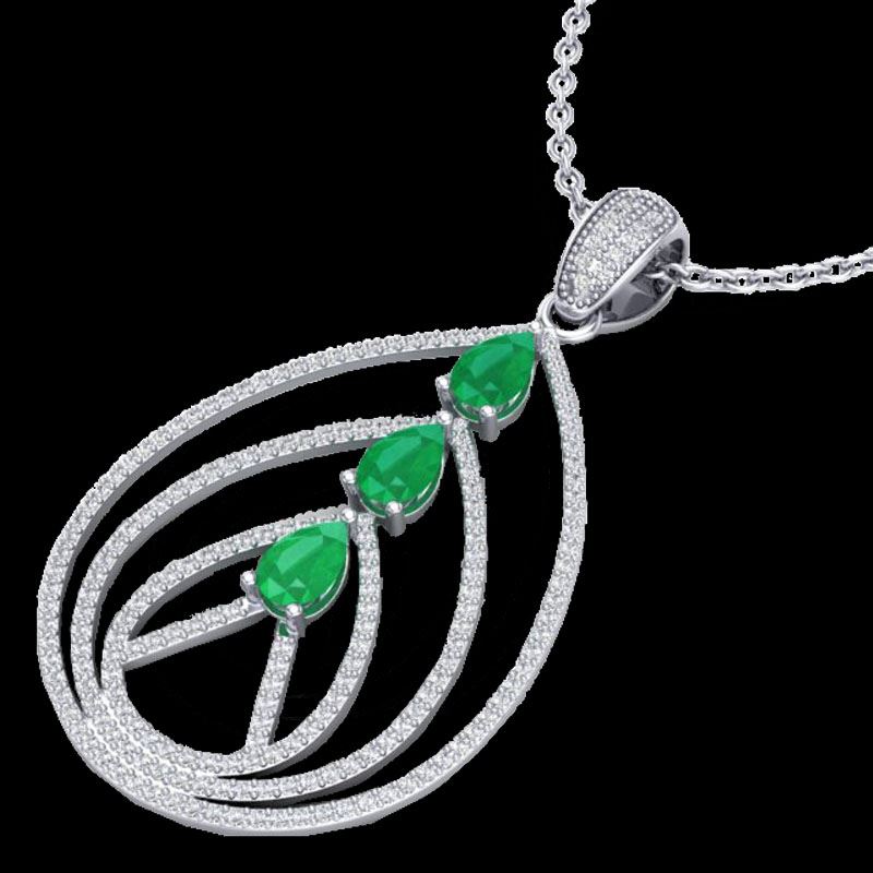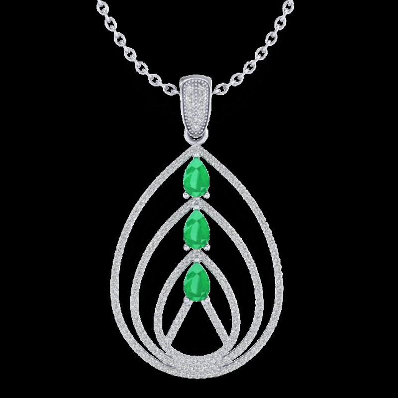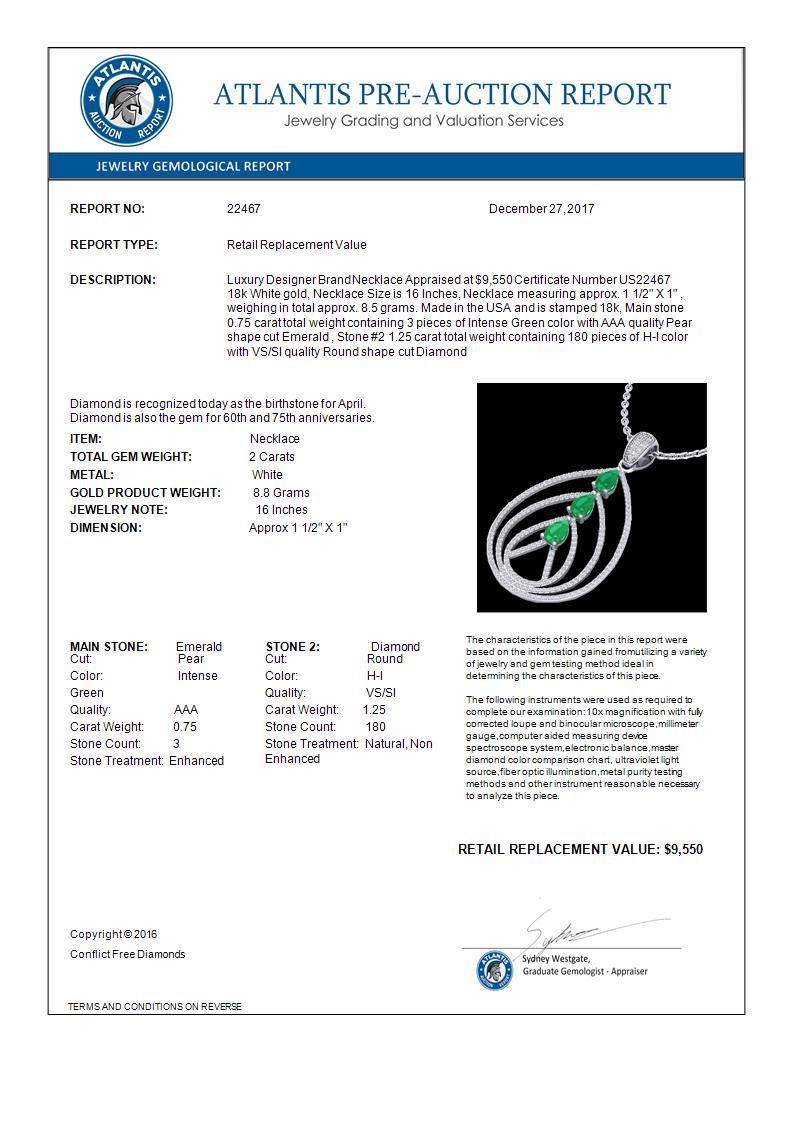 REF-133M3H -22467 ---- 2 CTW Emerald & Micro Pave VS/SI Diamond Designer Necklace 18K White Gold ---- Luxury Designer Brand Necklace Appraised at $9,550 Certificate Number US22467 18k White gold, Necklace Size is 16 Inches, Necklace measuring approx. 1 1/2" X 1" , weighing in total approx. 8.5 grams. Made in the USA and is stamped 18k, Main stone 0.75 carat total weight containing 3 pieces of Intense Green color with AAA quality Pear shape cut Emerald , Stone #2 1.25 carat total weight containing 180 pieces of H-I color with VS/SI quality Round shape cut Diamond