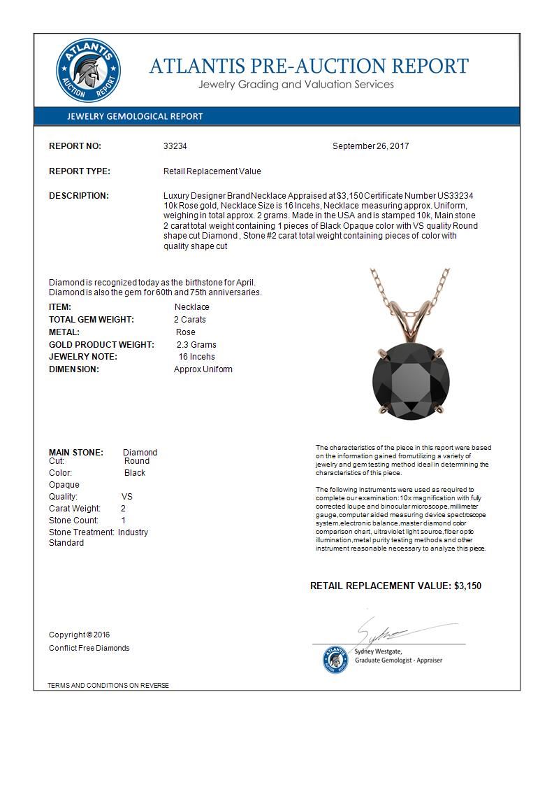 33234 - REF-43M2F ---- 2 CTW Fancy Black VS Diamond Solitaire Necklace 10K Rose Gold ---- Luxury Designer Brand Necklace Appraised at $3,150 Certificate Number US33234 10k Rose gold, Necklace Size is 16 Incehs, Necklace measuring approx. Uniform, weighing in total approx. 2 grams. Made in the USA and is stamped 10k, Main stone 2 carat total weight containing 1 pieces of Black Opaque color with VS quality Round shape cut Diamond , Stone #2 carat total weight containing pieces of color with quality shape cut