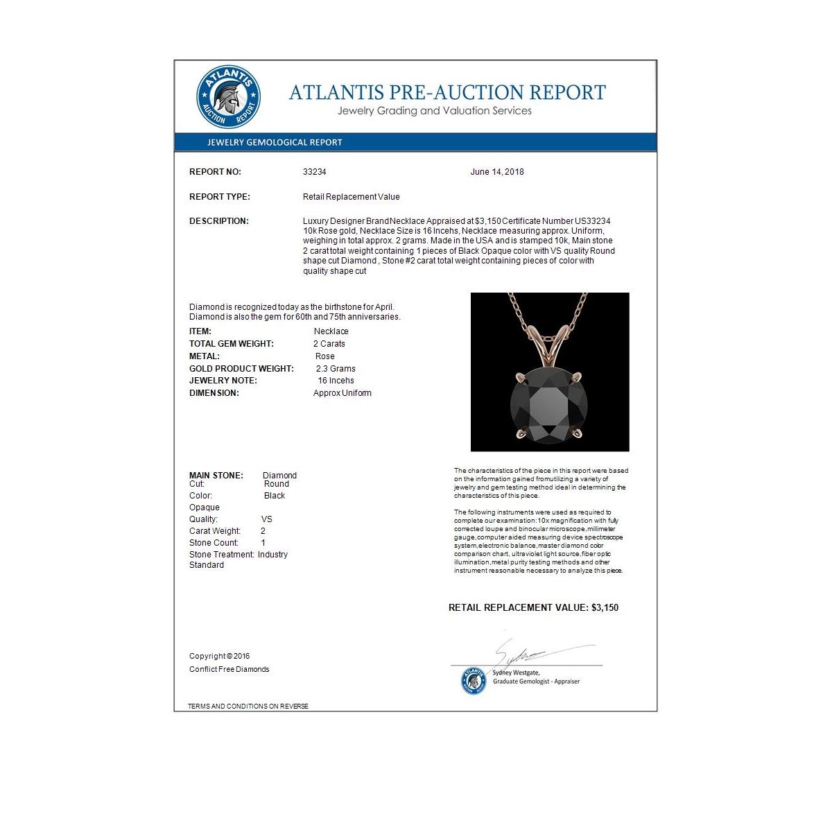 REF-43Y2K -33234 ---- 2 CTW Fancy Black VS Diamond Solitaire Necklace 10K Rose Gold ---- Luxury Designer Brand Necklace Appraised at $3,150 Certificate Number US33234 10k Rose gold, Necklace Size is 16 Incehs, Necklace measuring approx. Uniform, weighing in total approx. 2 grams. Made in the USA and is stamped 10k, Main stone 2 carat total weight containing 1 pieces of Black Opaque color with VS quality Round shape cut Diamond , Stone #2 carat total weight containing pieces of color with quality shape cut