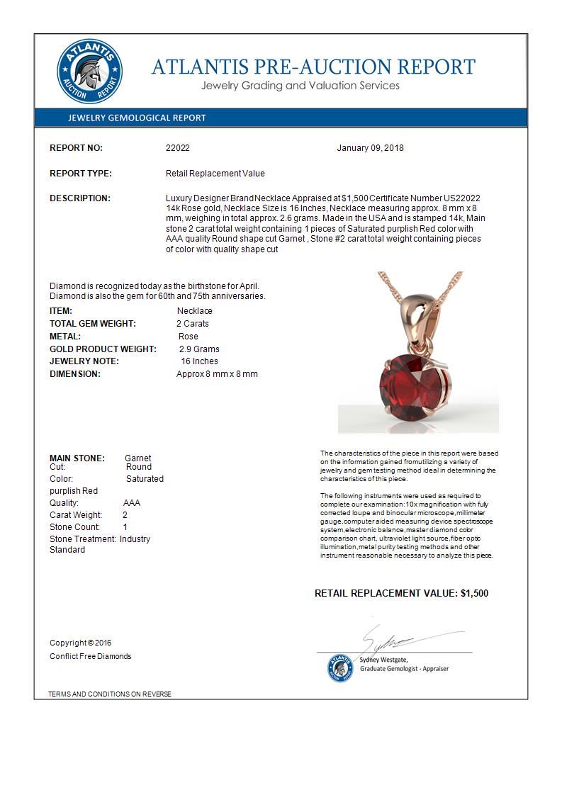 REF-24A9X -22022 ---- 2 CTW Garnet Designer Inspired Solitaire Necklace 14K Rose Gold ---- Luxury Designer Brand Necklace Appraised at $1,500 Certificate Number US22022 14k Rose gold, Necklace Size is 16 Inches, Necklace measuring approx. 8 mm x 8 mm, weighing in total approx. 2.6 grams. Made in the USA and is stamped 14k, Main stone 2 carat total weight containing 1 pieces of Saturated purplish Red color with AAA quality Round shape cut Garnet , Stone #2 carat total weight containing pieces of color with quality shape cut
