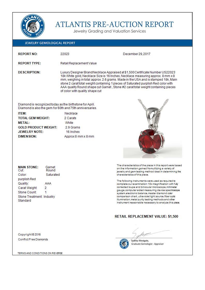 REF-24W5F -22023 ---- 2 CTW Garnet Designer Inspired Solitaire Necklace 18K White Gold ---- Luxury Designer Brand Necklace Appraised at $1,500 Certificate Number US22023 18k White gold, Necklace Size is 16 Inches, Necklace measuring approx. 8 mm x 8 mm, weighing in total approx. 2.6 grams. Made in the USA and is stamped 18k, Main stone 2 carat total weight containing 1 pieces of Saturated purplish Red color with AAA quality Round shape cut Garnet , Stone #2 carat total weight containing pieces of color with quality shape cut