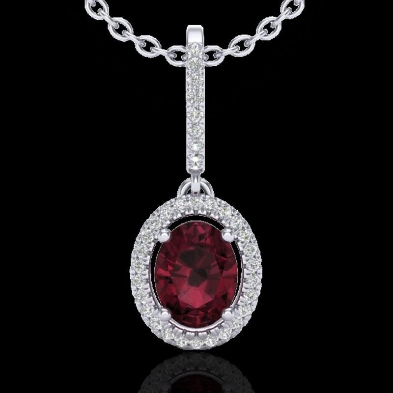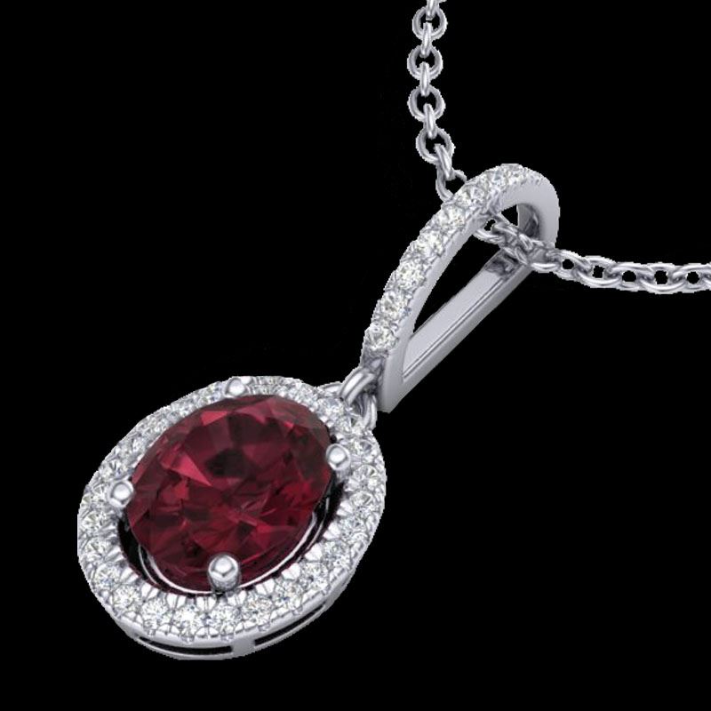 2 CTW Garnet & Micro Pave VS/SI Diamond Necklace Solitaire Halo 18K White Gold ---- Luxury Designer Brand Necklace Appraised Retail Price at $3,850 ---- SKU Number US20661 18k White gold Necklace Size is 16 Inches, Necklace measuring approx. 1/2" X 1/2" , weighing in total approx. 4.4 grams. Made in the USA and is stamped 18k, Main stone 1.65 carat total weight containing 1 pieces of Saturated purplish Red color with AAA quality Oval shape cut Garnet , Stone #2 0.35 carat total weight containing 37 pieces of H-I color with VS/SI quality Round shape cut